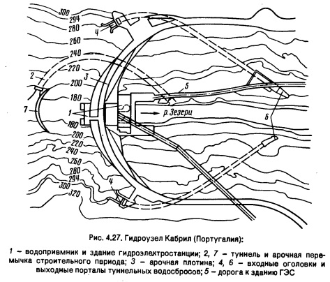 Основание в створе гидроузла Кариба сложено в основном гнейсами; в правом примыкании есть небольшой выход слоя трещиноватых кварцитов. Гидроузел Кабора Басса (Мозамбик) располагается в узком и глубоком каньоне реки Замбези. Состав сооружений компоновки гидроузла: арочная плотина; глубинный водосброс из восьми отверстий, перекрываемых плоскими Катковыми затворами со стороны верхнего бьефа и сегментными - с нижнего; два здания подземных ГЭС с суммарной мощностью 4000 МВт. Пропуск максимальных расходов периода строительства (12 000 м3/с) предусматривалось проводить двумя туннелями 16x16 м, с суммарной пропускной способностью 4500 м3/с. В связи с этим допусками ежегодное двухмесячное затопление котлована в период дождей. Для этого разработали специальную конструкцию каменно-набросных перемычек, не разрушающихся во время поверхностного перелива через них строительных расходов. Они в течение четырех недель пропускали расходы до 7000 м3/с и сохранились в удовлетворительном состоянии.