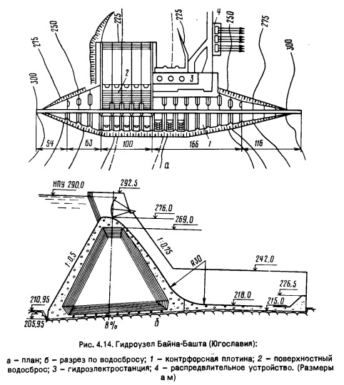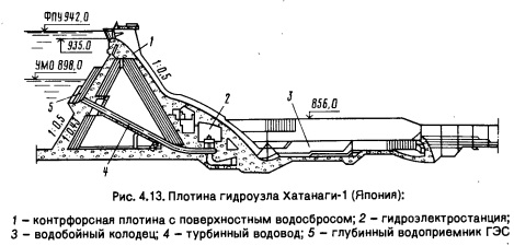 4.3. Характеристика гидроузлов с открытыми водосбросами, совмещенными с контрфорсными плотинами, с сопряжением бьефов по типу донного гидравлического прыжка контрфорсными плотинами: совмещенные с плотинами и работающие по схеме сопряжения с донным гидравлическим прыжком, с сопряжением бьефоф путем отброса струй; расположенные в береговых примыканиях. Наибольшее распространение получила первая схема. Примерами гидроузлов, выполненных по этой схеме, служат гидроузлы Абелардо Родрикес (Мексика), Хашим Эль Джирба (Судан) и др. (табл. 4.3). Гидроузел Хатанаги-1 (Япония) с одной из самых высоких контрфорсных плотин в мире имеет в составе своей компоновки гидроэлектростанцию, примыкающую к плотине со стороны нижнего бьефа (рис. 4,13). Водосбросные сооружения представлены в этом гидроузле поверхностным водосливом, сливная грань которого проходит поверх крыши здания гидростанции. Избыточная энергия сбросных расходов гасится в водобойном колодце достаточно сложной конструкции. Интересный пример устройства открытого водосброса, совмещенного с контрфорсной плотиной со спаренными контрфорсами, - гидроузел Байна-Башта в Югославии (рис. 4.14). Водосброс расположен в центральной части плотины и имеет пять пролетов, перекрываемых на гребне сегментными затворами размером 16,5x14,0 м. Избыточная энергия паводковых расходов гасится в водобойном колодце, имеющем на выходе водобойную стенку высотой 8,5 м. В отдельных случаях водосбросные сооружения гидроузлов с контрфорсными плотинами в странах с жарким климатом выполняют двухъярусного типа - в каждом из пролетов, располагающихся между контрфорсами, имеются и поверхностный перелив, и пропуск расхода через глубинные отверстия. Пример такой конструкции - водосброс гидроузла Хашим Эль Джирба (Судан) (рис. 4.15). Верхний ярус работает в нем в режиме свободного перелива и падения струи на водобойную плиту между контрфорсами. Для предохранения возможных повреждений затвора глубинного отверстия плавающими телами предусмотрен отражатель. Пролеты перекрываются затворами: поверхностные - плоскими, глубинные - сегментными размером соответственно 7,Ох х7,05 и 7,0x7,3 м. Водосброс имеет семь пролетов, его максимальная пропускная способность 8700 м3/с.