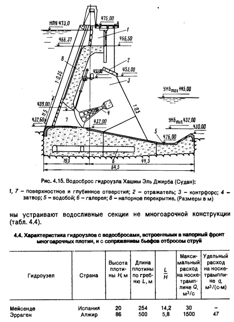 Как правило, водобойные колодцы водосбросов контрфорсных плотин ничем не отличаются от колодцев гравитационных водосливных плотин. В многоарочных плотинах расчетные расходы иногда пропускают через гребни арок с последующим свободным падением струй на плиты основания. В некоторых случаях между многоарочными частями плотины устраивают водосливные секции не многоарочной конструкции (табл. 4.4).