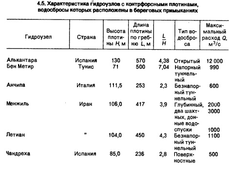 4.4. Характеристика гидроузлов с водосбросами, встроенными в напорный фронт многоарочных плотин, и с сопряжением бьефов отбросом струй Пропуск расходов в гидроузлах с контрфорсными плотинами осуществляется и через их боковые примыкания (табл. 4.5).