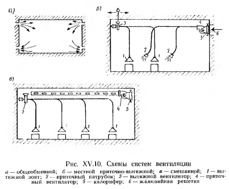 КЛАССИФИКАЦИЯ СИСТЕМ ВЕНТИЛЯЦИИВ соответствии с назначением системы вентиляции могут быть вытяжными и приточными. Вытяжная система вентиляции служит для удаления загрязненного воздуха из помещений в атмосферу, а приточная предназначается для подачи в помещения чистого воздуха взамен удаленного. Иногда устраивают только лишь вытяжную систему вентиляции (например, из уборных, ванных и курительных комнат). В этом случае удаляемый воздух возмещается из соседних помещений и через неплотности ограждений, окон, дверей и др. По способу перемещения воздуха различают естественную и механическую системы вентиляции. Движение воздуха в системе естественной вентиляции (иногда ее называют гравитационной) происходит вследствие разности удельных весов холодного наружного и теплого внутреннего воздуха без затраты электрической энергии. При механической системе вентиляции воздух перемещается вентиляторами, использующими электрическую энергию. Вентиляционные устройства, оборудованные вентиляторами, калориферами и электромоторами, а также очистными или увлажнительными приспособлениями, носят название вентиляционных установок. Радиус действия системы вентиляции с механическим побуждением определяется технико-экономическим подсчетом, в зависимости от мощности вентилятора, и принимается в пределах 30—50 м. Радиус действия естественной вентиляции не превышает 8 м. Вентиляционные системы (рис. XV. 10) могут быть общеобменными, местными и смешанными (комбинированными). Общеобменная приточно-вытяжная система позволяет вентилировать все помещение. Она применяется в тех случаях, когда в помещении выделяются небольшие избытки тепла и влаги, немного газов и пыли и когда они образуются единовременно во многих местах. В общественных зданиях, как правило, устраивается общеобменная система вентиляции. Местная система вентиляции может быть вытяжной и приточной. Местная вытяжная система вентиляции удаляет загрязненный воздух непосредственно из мест образования вредных выделений. Ее устраивают в виде вытяжных шкафов, зонтов, всевозможных бортовых отсосов и отсосов из укрытий оборудования (станков, печей). Местная приточная система вентиляции осуществляется, как правило, с механическим побуждением. Воздух через приточные отверстия, насадки и патрубки на воздуховодах поступает в отдельные зоны помещений,и непосредственно к рабочим местам. В частности, летом в горячих цехах воздух организованно подается к рабочим местам, расположенным в зоне интенсивного облучения от нагретого оборудования и изделий, в виде воздушного душа. Воздушный душ — это сосредоточенная струя воздуха, охлаждающее действие которой основано на разности температур тела человека и потока воздуха, а также на повышенной скорости обтекающей струи. ![]() Приток воздуха в системе местной приточной вентиляции может осуществляться и в виде воздушных завес, устраиваемых в зимнее время для защиты от холодного воздуха, врывающегося через открываемые ворота производственных цехов или через наружные двери в вестибюлях общественно-административных зданий. В производственных помещениях чаще всего применяется смешанная система вентиляции, т. е. одновременно используются общеобменная и местная системы. Так, в большинстве горячих цехов в летнее время основной является об