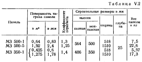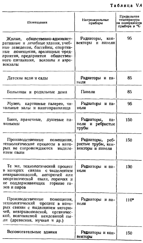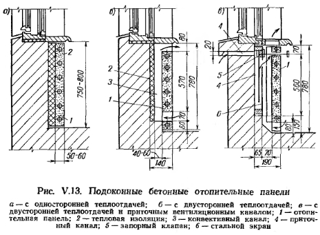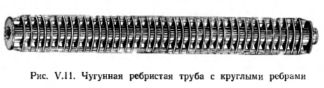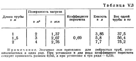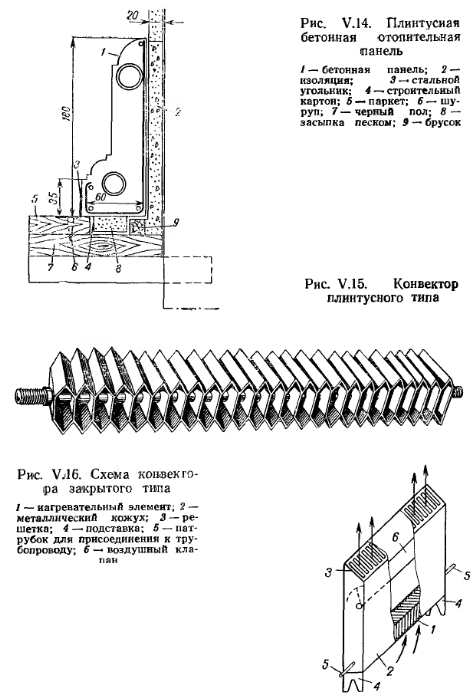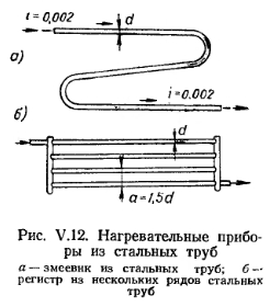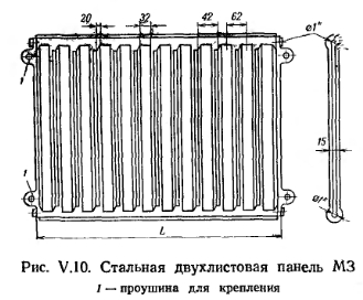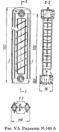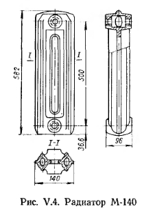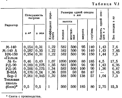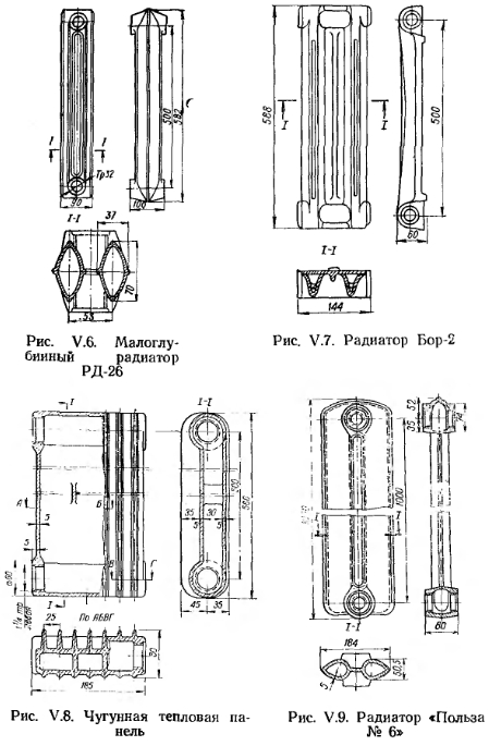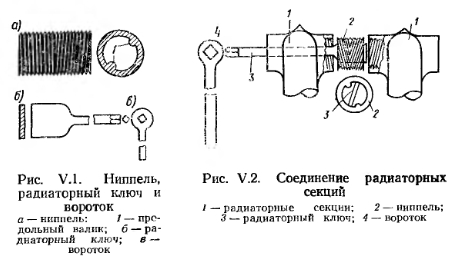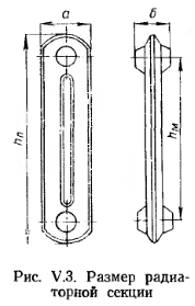 КОНСТРУКЦИИ НАГРЕВАТЕЛЬНЫХ ПРИБОРОВ И ИХ ТЕХНИЧЕСКИЕ ХАРАКТЕРИСТИКИК нагревательным приборам, применяемым в системах центрального отопления, относятся чугунные и стальные радиаторы, чугунные ребристые трубы, стальные и чугунные конвекторы, бетонные отопительные панели и приборы, изготовляемые из стальных труб в виде регистров и змеевиков. Чугунные радиаторы. Чугунные радиаторы являются наиболее распространенным видом нагревательного прибора. Их отливают из серого чугуна отдельными секциями или блоками, состоящими из нескольких секций. Из этих секций собирают приборы с поверхностью нагрева, требуемой по расчету. Секции радиаторов в зависимости от числа вертикальных каналов подразделяют на одноканальные, двухканальные и многоканальные. В настоящее время применяются исключительно двухканальные радиаторы. Секции радиаторов соединяют на специальных станках в нагревательные приборы при помощи ниппеля — короткого цилиндра с наружными резьбами (с одного конца — правой, а с другого — левой) и двумя продольными приливами (валиками) на внутренней поверхности (рис. V. 1 ,а). Для соединения секции между собой используют торцевой радиаторный ключ (рис. V. 1,6), расплющенный на одном конце в виде лопаточки. При свертывании секций лопаточка радиаторного ключа упирается в валик ниппеля и придает ниппелю при помощи воротка (рис. V. 1, в) вращательное движение. Соединение радиаторных секций показано на рис. V. 2. Радиаторные секции соединяют между собой на прокладках толщиной до 1,5 мм. При теплоносителе горячая вода с температурой до 100°С применяются прокладки из тряпичного картона, смоченные в воде и проваренные в натуральной олифе со свинцовым суриком; при теплоносителе пар и вода с температурой выше 100°С — прокладки из паронита, проваренные в том же составе. Можно также применять прокладки из термостойкой резины. В отверстия крайних секций сгруппированного радиатора ввернуты четыре чугунные пробки, из которых две сквозные служат для присоединения прибора к трубопроводу, а две без отверстий — глухие. Размер радиаторной секции определяется ее строительной (монтажной) высотой hполной высотой hn, глубиной а и шириной б (рис. V. 3). Строительной и монтажной высотой радиаторной секции называется расстояние между центрами ниппельных отверстий секции. Чугунные радиаторы рассчитываются на рабочее давление ![]() ![]() ![]() Для теплотехнической оценки того или иного нагрева тельного прибора служит так называемый «коэффициент пересчета», который показывает, во сколько раз экм того или иного прибора превышает квадратный метр. Чем больше это отношение, тем больше теплоотдача прибора. ![]() В табл. V.1 приведены технические характеристики некоторых радиаторных секций, из которых группируются нагревательные приборы. Наибольшее распространение в настоящее время получил радиатор М-140 (рис. V. 4). По сравнению с радиаторами старого типа (Н- 136, М-150 и др.) он имеет более высокие теплотехнические и технико-экономические показатели. В настоящее время промышленность стала изготовлять радиаторы М-140 А (рис. V. 5), отличающиеся от радиаторов М-140 более развитой поверхностью нагрева. Для увеличения поверхности нагрева внутри секции радиатора М-140 А (в ее водяном пространстве) имеется восемь ребер, расположенных под углом 45° к вертикали. Радиаторы РД-26 (рис. V. 6), а также р