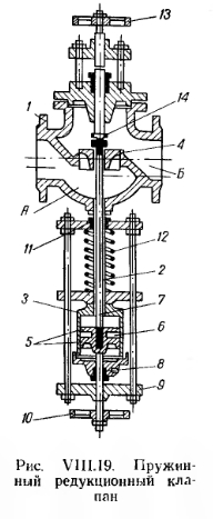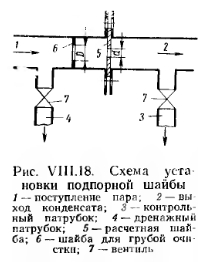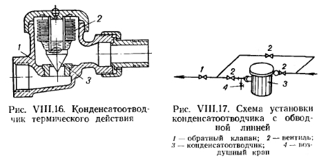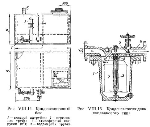 КОНСТРУКТИВНЫЕ ЭЛЕМЕНТЫ ПАРОВОГО ОТОПЛЕНИЯКонденсационные баки. Конденсационный бак служит емкостью для конденсационной воды, поступающей из разомкнутой системы парового отопления. Конденсационный бак сообщается с атмосферой и имеет герметически закрывающийся люк, водомерное стекло, переливную и спускную трубки. На рис. VIII. 14 показан типовой конденсационный бак емкостью 1000 л, сваренный из листовой стали. ![]() Емкость конденсационного бака в небольших котельных может быть принята равной объему конденсата, поступающего из систем отопления за 1—2 ч, а в больших котельных (с поверхностью нагрева котлов больше 200 м2) — объему конденсата, поступающего за время от 30 мин до 1 ч. Конденсатоотводчики. Назначение конденсатоотводчиков — препятствовать прорыву пара в конденсатопровод, так как пар не всегда успевает сконденсироваться в нагревательных приборах и частично поступает в конденсационную лилию. Простейшим видом конденсатоотводчика является петля, согнутая из трубы (см. рис. VIII.3), которая играет роль водяного затвора и применяется при небольших давлениях пара (порядка 0,1 кгс/см2). Принцип действия конденсатоотводчиков рассмотрим на примере (рис. VIII. 15). В зависимости от диаметров приемного и выходного отверстий (от Б до й—Б0мм) производительность конденсатоотводчиков этого вида меняется соответственно от 150 до 2800 кг/ч конденсата. Конденсат поступает через приемное отверстие корпуса 1. При подъеме уровня конденсата поплавок 2 всплывает вместе со стержнем 3, снабженным золотником 4. Последний закрывает отверстие 5 в отводной канал 6. При дальнейшем поступлении конденсат переливается в поплавок, который, опускаясь, открывает отверстие отводного канала. После выдавливания конденсата паром поплавок снова всплывает, закрывая отверстие в канал 6. Вентиль 5 служит для выпуска воздуха и пропуска через горшок больших количеств конденсата во время пуска системы отопления в действие. После прогрева трубопровода вентиль 5 закрывают. Для предотвращения затекания конденсата обратно в конденсатоотводчик служит обратный клапан 7 Для паровых систем низкого давления (от 0,2 кгс/см2) применяется конденсатоотводчик термического действия (рис. VIII.16). Он состоит из корпуса 1, в котором расположен сильф он 2, выполняемый из легко расширяющегося сплава в виде герметически закрытой коробки с волнистыми стенками Оильфон заполняется жидкостью, которая имеет температуру точки кипения 90—95°С. С сильфоном соединен клапан 3, открывающий и закрывающнй отверстие для выхода конденсата. При поступлении в конденсатоотводчик вместе с конденсатом пара жидкость в сильфоне вскипает, сильфон от нагревания удлиняется, и клапан закрывает выход из конденсатоотводчика. При охлаждении конденсата сильфон сжимается и открывает выход для конденсата. Конденсатоотводчики подбирают по таблицам их технических характеристик и номограмм с учетом необходимой производительности и перепада давлений. ![]() При установке конденсатоотводчиков предусматривается устройство обводной линии, служащей для пропуска конденсата во время прочистки и ремонта конденсатоотводчика (рис. VIII.17). Подпорные шайбы. Вместо конденсатоотводчиков в ряде случаев можно устанавливать подпорные шайбы. Принцип действия подпорной шайбы основан на том, что при одной и той же разности давлений до и пос