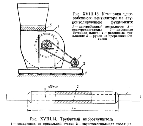 МЕРОПРИЯТИЯ ПО БОРЬБЕ С ШУМОМ И ВИБРАЦИЕЙ ВЕНТИЛЯЦИОННЫХ УСТАНОВОККаждая вентиляционная установка, в которую входит вентилятор с электродвигателем, при работе вибрирует и создает шум. При этом вентиляторы, соединенные с электродвигателем на клиноременной передаче, создают больше шума, чем электровентиляторы. Шум возникает при вибрации лопастного колеса и кожухов вентилятора и электродвигателя, при трении подшипников и при работе клиноременной передачи. Кроме того, вихревые движения воздуха внутри вентилятора (и особенно на входе и выходе воздуха) дополнительно усиливают шум. Шум распространяется по каналам (воздуховодам) в помещения зданий, находящиеся иногда на значительном расстоянии от вентиляционной установки, особенно при приточной системе вентиляции. Одновременно с этим шум может также передаваться по наружным ограждениям здания, связанным с фундаментом установки. Шум, создаваемый вентиляционной установкой, отрицательно влияет на самочувствие людей. В ряде случаев, кроме того, сильная вибрация приводит к преждевременному износу вентиляционного оборудования и даже может быть причиной разрушения строительных конструкций здания. Основные мероприятия по устранению вибрации и шума сводятся к ограничению окружной скорости колеса вентилятора, тщательной отбалансировке его, уменьшению скорости движения воздуха в воздуховодах, а также к устройству виброзвукопоглощающих фундаментов под вентиляторы и электродвигатели. Окружную сковость колеса вентилятора рекомендуется принимать для жилых и общественных зданий не выше 25—Ж м/сек, а для производственных зданий — не более 50 м/сек. Скорости воздуха в воздуховодах общественных зданий не должны превышать 8, а для промышленных зданий 12 м/сек. Правильность отбалансировки колеса вентилятора (полное равновесие при вращении по отношению к оси вращения) проверяют путем медленного вращения колеса с остановкой его рукой. При этом колесо должно останавливаться в любом положении, без какой-либо откатки в ту или обратную сторону. При неотбалансированном колесе центр его тяжести находится вне оси вращения, вследствие чего под действием центробежной силы вибрация агрегата усиливается. Балансировку колеса производят на специальном станке. Она заключается в наложении на одну из сторон колеса (по окружности) накладок из мягкого металла (например, свинца). Иногда для уменьшения шума прибегают к искусственному уменьшению числа оборотов колеса, принимая к установке вентилятор с номером, больше расчетного. Передаче вибрации препятствует и соединение вентилятора с воздуховодами посредством коротких рукавов, изготовленных из плотной прорезиненной ткани. ![]() Для предотвращения передачи вибрации строительным конструкциям здания вентиляторы устанавливают на виброизолирующих основаниях заводского изготовления. Между основанием и станиной вентилятора при этом прокладываются прокладки из листовой резины толщиной i5 мм. Боковые поверхности отдельно зазор заполнять упругим неорганическим материалом (например, битумизированным войлоком). На рис. XVIII. 13 схематически показана установка вентиляционного агрегата на звукоизолирующем фундаменте. При укладке воздуховодов из кровельной листовой стали их фланцы соединяются на резиновых или асбестовых прокладках. Для глушения ш
