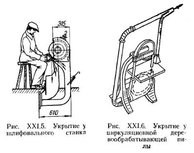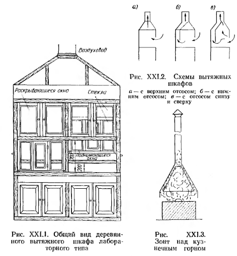 МЕСТНАЯ ВЫТЯЖНАЯ ВЕНТИЛЯЦИЯМести ан вытяжная вентиляция предназначена для улавливания всевозможного рода вредных выделений (пыли, производственных отходов, газов, паров, тепла и пр.) в местах ,их образования. Для локализации и улавливания вредных выделений применяются местные отсосы и укрытия. Местные отсосы устанавливают, как правило, у рабочих мест таким образом, чтобы они не мешали рабочему процессу и по возможности полнее укрывали места выделений вредностей. Уделяемый вместе с вредными выделениями воздух ни в коем случае не должен проходить через зону дыхания работающего. Устраивая местные отсосы, следует иметь в виду, что вредные выделения следует удалять в направлении их естественного движения. Так, пары и горячие газы надо удалять вверх, а пыль и тяжелые газ — вниз. По конструкции местные отсосы подразделяют на полностью закрытые, полузакрытые и открытые. В полностью закрытых местных отсосах устранена всякая возможность поступления вредностей в рабочие места. Такие укрытия выполняются в виде герметически закрытых кожухов, в которых предусмотрены дверки, периодически открываемые в соответствии с требованиями технологического процесса. Когда же технологические условия производства не позволяют применить полное укрытие, прибегают к устройству полуоткрытых и открытых местных отсосов. Следует иметь в виду, что при открытых местных отсосах вместе с улавливаемыми вредными выделениями отсасываются значительные объемы воздуха. Вытяжные шкафы. Вытяжные шкафы (рис. XXI. 1) относятся к полуоткрытым местным отсосам и находят применение в различных отраслях промышленности. По конструкции вытяжные шкафы могут быть весьма разнообразны, а по способу отсоса из них воздуха их подразделяют на шкафы с верхним, нижним и комбинированным отсосами (рис. XXI. 2). ![]() При рабочих процессах, сопровождающихся восходящими токами вредных выделений, используют шкафы с верхним отсосом воздуха, а при рабочих процессах с выделением пыли или тяжелых газов — с нижним или комбинированным (сверху и внизу) отсосами. Нижний отсос способствует естественному осаждению пыли и тяжелых газов и быстрому их удалению. Комбинированный отсос применяется при интенсивной циркуляции воздуха в шкафу. Количество воздуха, отводимого сверху и снизу при комбинированном отсосе, регулируется задвижкой в отсасывающем патрубке. Примером шкафа с комбинированным отсосом может быть обычный лабораторный химический шкаф, в котором сверху отсасывается 2/з, а снизу /з общего количества воздуха. Зонты. Зонты—самые простые и наиболее распространенные типы местных отсосов. Они применяются для улавливания вредных выделений, например над кузнечным горном (рис. XXI. 3). Зонты устраивают как с естественной, так и с механической вытяжкой воздуха. Обычно для удобства работающих зонты располагают возле них на высоте выше человеческого роста (т. е. на высоте- 1,8—2 м от пола). Для предупреждения выдувания вредных выделений из- под зонта в рабочее помещение зонты снабжают фартуками. Размеры зонта должны быть больше -размеров поверхности источников вредных выделений (ванн, горнов и пр.). Бортовые отсосы. Бортовые отсосы применяются в тех случаях, когда для улавливания вредных выделений нельзя полностью перекрыть технологическое оборудование. Широкое распространение они получили для 