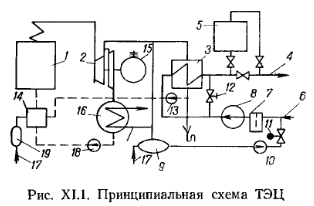 ОБЩИЕ СВЕДЕНИЯ О ТЕПЛОФИКАЦИИТеплоснабжение группы зданий или отдельного района города, осуществляемое из одного теплоисточника — районной котельной или теплоэлектроцентрали (ТЭЦ), принято называть централизованным теплоснабжением. Основными преимуществами централизованного теплоснабжения по сравнению с теплоснабжением от котельных небольшой мощности, обслуживающих одно или несколько зданий, являются: снижение расхода топлива на единицу тепловой энергии, за счет повышения к. п. д. мощных котельных установок; возможность эффективного сжигания как низкосортного топлива (торф, бурый уголь), так и наиболее эффективного (природного или искусственного газа), внедрение механизации и автоматизации топочных процессов, меньшее загрязнение атмосферного воздуха продуктами сгорания и др. Наиболее эффективным видом централизованного теплоснабжения является теплофикация, при которой тепловая энергия получается от тепловых электростанций (ТЭЦ), вырабатывающих одновременно электроэнергию и тепло. При централизованном теплоснабжении от ТЭЦ расход топлива в 2— 3 раза меньше, чем при снабжении от районной котельной. На рис. XI. 1 приведена принципиальная схема ТЭЦ, вырабатывающей электроэнергию и тепло для систем отопления, вентиляции и горячего водоснабжения. ![]() Пар высокого давления (до 200 ат) поступает от котла/в теплофикационную турбину 2. После расширения в турбине 2 пар поступает в водоподогреватель 3, где нагревает циркулирующую в теплосетях воду до требуемой температуры. Из водоподогревателя 3 вода поступает в тепловую сеть 4 непосредственно или после догрева в дополнительном (пиковом) котле 5. Догревание воды в пиковом котле применяется при значительном понижении температуры наружного воздуха. Охладившаяся в системах потребителей тепла вода по трубопроводу 6 возвращается в ТЭЦ для нового подогрева. Она проходит грязевик 7 и центробежным насосом 8 перемещается в подогреватель 3 и далее в пиковый котел 5 (в последнее время заменяется пиковым водоподогревателем), откуда вновь поступает через теплопровод 4 в систему теплоснабжения. При входе на ТЭЦ вода в сети пополняется добавочной химически очищенной водой из водоподготовки 9 подпиточным насосом № через регулятор давления 11. Перемычка с терморегулятором 12 служит для регулирования температуры воды за водоподогревателем. Конденсат пара из водоподогревателя 3 насосом 13 подается в деаэратор 14. Неиспользованный в отборе пар проходит во вторую часть турбины 2 с электрогенератором 15, где расширяется и поступает в конденсатор 16, охлаждаемый водой из водопровода 17. В конденсаторе отработанный пар конденсируется в воду и насосом 18 подается в деаэратор 14, где пополняется химически очищенной в водоподготовке 19 водой и поступает в котел. Михайлов Федор Семенович ОТОПЛЕНИЕ И ОСНОВЫ ВЕНТИЛЯЦИИ - М.: Стройиздат, 1972. |