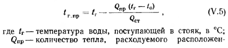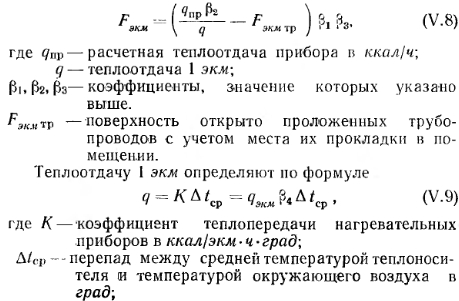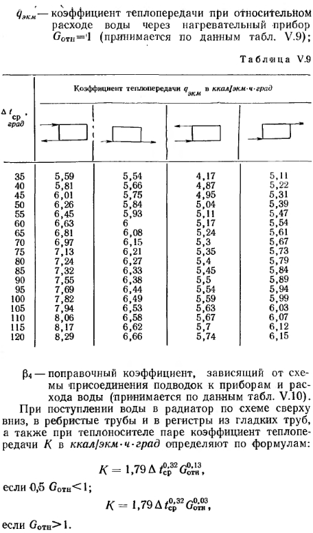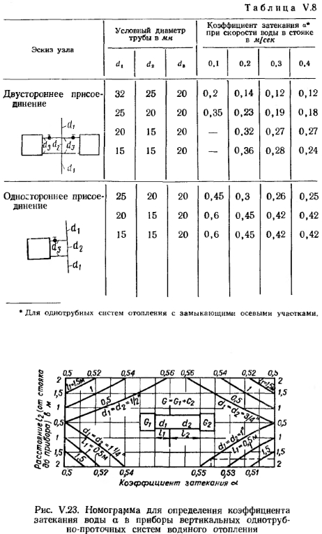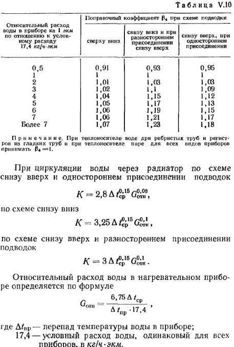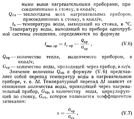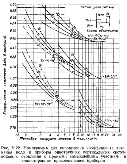 ОСОБЕННОСТИ ОПРЕДЕЛЕНИЯ ПОВЕРХНОСТИ НАГРЕВА ПРИБОРОВ ОДНОТРУБНЫХ СИСТЕМ ОТОПЛЕНИЯВ отличие от двухтрубных систем водяного отопления в однотрубных системах средние температуры и температурные перепады в приборах различны. Это объясняется тем, что горячая вода, распределяемая по приборам последовательно, из лежащего выше прибора поступает в прибор, расположенный ниже по стояку, уже с пониженной температурой. Перепад температур воды в приборах может быть равен перепаду температур воды в системе отопления, но может отличаться от него в ту или другую сторону. В однотрубной системе водяного отопления температуру воды, поступающей в прибор, определяют по формуле ![]() ![]() Чем выше коэффициент затекания, тем большее количество воды поступает в прибор. Количество воды, проходящей через прибор, а следовательно, и коэффициент затекания а зависят от способа присоединения приборов (одностороннее и двухстороннее), соотношения диаметров стояка, замыкающего участка и трубных подводок к прибору, а также от тепловой нагрузки приборов и скорости движения воды в стояке. Значения коэффициентов затекания воды в приборы однотрубных вертикальных систем отопления с замыкающими участками определяются по номограммам, изображенным на рис. V. 22. Прием пользования номограммами уточняем примером. ![]() В зависимости от скорости движения воды в стояке коэффициент затекания а можно также принимать но данным табл. V. 8. Значение коэффициента затекания приборов вертикальных однотрубных проточных систем отопления можно принимать по номограмме, изображенной на рис. V. 23. Из этой номограммы видно, что при увеличении длины подводок к одному из смежных приборов величина коэффициента затекания воды в прибор изменяется весьма незначительно. Так, если трубные подводки к одному прибору имеют длину 2 ж, а к другому 0,5 м, то при равных у них диаметрах 3/4" через ближайший к стояку прибор пройдет 56%, а через отдаленный прибор 44% воды, циркулирующей по стояку. Если у смежных приборов диаметры и длина подводок одинаковы, то через приборы, независимо от величин их тепловых нагрузок, будет проходить одинаковое количество воды. ![]() При разных длинах и диаметрах трубных подводок к приборам количество воды, циркулирующей через один из приборов, Gnp. I=«] GCT, а количество воды, проходящей через другой прибор, будет равно Gnp. 2=GCT— — Gnp.i, где GCT —количество воды, циркулирующей по стояку. В вертикальной однотрубной проточной системе отопления вся вода из стояка проходит через приборы, поэтому в этих системах коэффициент затекания всегда выше, чем в системах с замыкающими участками. Для увеличения коэффициента затекания в однотрубных вертикальных системах с замыкающими участками уменьшают диаметр замыкающих участков по сравнению с диаметром стояка. При определении поверхности нагрева приборов однотрубных систем отопления необходимо проводить предварительный расчет трубопроводов, позволяющий установить диаметры стояков, замыкающих участков и подводок к приборам. Определение поверхности нагрева приборов в экм. Поверхность нагрева, выраженную в экм, определяют по формуле ![]() ![]() ![]() Если величины F или F3KM не соответствуют поверхности целого числа секций радиатора или стандартным длинам ребристых труб, то принимают соответственно ближайшее большее число секций радиаторов или 