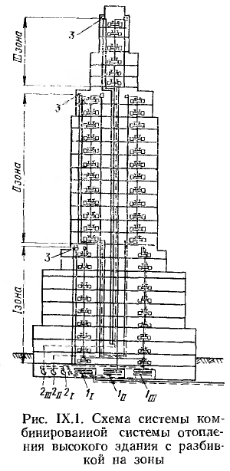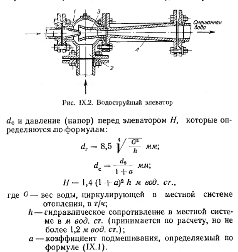 ПАРОВОДЯНАЯ И ВОДОВОДЯНАЯ СИСТЕМЫ ОТОПЛЕНИЯКомбинированные системы отопления в зависимости от вида первичного теплоносителя (нагревающего воду) подразделяются на пароводяные и водоводяиые. В пароводяных системах вода для систем водяного отопления нагревается паром, а в водоводяных системах — высокотемпературной водой. Принципиальная схема этих систем рассматривалась ранее (см. рис. 1.4). Как видно из этой схемы, теплообменник 3 заменяет собой котел обычной системы водяного отопления. Теплоноситель в виде пара или высокотемпературной воды подводится к теплообменнику 3 по трубопроводу 2 и удаляется из него по трубопроводу 5 обратно в котел, не смешиваясь с водой, циркулирующей в системе отопления. Системы пароводяного и водоводяного отопления могут выполняться по любой схеме как с естественной, так и с искусственной циркуляцией воды. Пароводяные системы устраивают в тех случаях, когда по назначению здания в нем требуется устройство только водяных систем отопления, а котельная оборудована паровыми котлами, предназначенными в основном для обслуживания паром технологических нужд промышленного предприятия. Системы пароводяного и водоводяного отопления применяются для отопления высотных зданий. Такие здания для уменьшения гидростатического давления на нагревательные приборы (допускаемое 4 кгс1см2) разбивают по высоте на отдельные зоны и в каждой зоне устраивают самостоятельную систему водяного отопления (рис. 1ХЛ) со своим теплообменным аппаратом. Учитывая, что стальные трубы выдерживают значительно более высокое давление, чем приборы (до 20 кгс/см2), и что трубные соединения можно выполнять на аварке, теплообменники I и циркуляционные иасосы 2, обслуживающие зоны 1, II и III, можно располагать, как указано на рис. IX. 1, в подвальном этаже высотного здания. Расширительные сосуды 3 устанавливают в верхних этажах каждой из зон. ![]() Системы водоводяного отопления часто устраивают без теплообменника, непосредственно смешивая высокотемпературную воду (130— 150°С) с охлажденной водой из местной системы отопления (70°С) при помощи водоструйного элеватора. Водоструйный элеватор (рис. IX.2) состоит из конусообразного сопла 1, через которое поступает высокотемпературная вода, камеры всасывания 2, в которую поступает охлажденная вода из обратного трубопровода отопительной системы, смесительного конуса 3, в котором высокотемпературная вода смешивается с охлажденной водой из системы отопления, и диффузора (горловины) 4, присоединяемого к горячему трубопроводу местной системы. Основной расчетной характеристикой элеватора является так называемый коэффициент подмешивания, или, как его иногда называют, коэффициент инжекции. Коэффициент подмешивания а представляет собой отношение веса Gi подмешиваемой (охлажденной) воды, поступающей из местной системы, к весу G2 высокотемпературной воды и определяется по формуле ![]() Для подбора элеватора необходимо знать диаметр горловины dr (в наименьшем ее сечении), диаметр сопла ![]() Михайлов Федор Семенович ОТОПЛЕНИЕ И ОСНОВЫ ВЕНТИЛЯЦИИ - М.: Стройиздат, 1972. |
