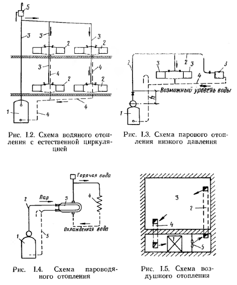 ПРИНЦИПИАЛЬНЫЕ СХЕМЫ СИСТЕМ ЦЕНТРАЛЬНОГО ОТОПЛЕНИЯНа рис. 1.2 приведена схема системы водяного отопления с естественной циркуляцией воды. Система состоит из теплового генератора (котла), нагревательных приборов и разводящей сети трубопроводов. Нагретая в котле 1 горячая вода по подающим трубопроводам поступает в нагревательные приборы 2, установленные в помещениях двухэтажного здания. В нагревательных приборах вода охлаждается и передает часть тепла через стенки приборов воздуху помещений, а затем охлажденная вода по трубопроводам 4 возвращается в котел, где вновь подогревается. Расширительный сосуд 5 предназначен для аккумулирования прироста объема воды, возникающего при ее нагревании, и для удаления воздуха из системы. Вода циркулирует в системе под действием разности объемных весов охлажденной воды в трубопроводах 4 и горячей воды в трубопроводах 3. ![]() На рис. 1.4 представлена схема пароводяного отопления. Пар из котла 1 поступает по паропроводу 2 в теплообменник 3, предназначенный для нагревания воды в системе водяного отопления 4. Охладившись в теплообменнике, пар конденсируется, и конденсационная вода по конденсатопроводу 5 поступает в котел. Такая комбинированная система отопления отличается от системы отопления, показанной на рис. 1.2, лишь тем, что в ней теплоноситель нагревается не в котле, а в пароводяном теплообменнике. В системе воздушного отопления (рис. 1.5) наружный воздух, подогреваясь в воздухоподогревателе (калорифере) 1, поступает по приточному каналу 2 в отапливаемое помещение 3. Поступивший воздух охлаждается до температуры помещения и по вытяжному каналу 4 возвращается обратно в калорифер, где вновь подогревается. В ряде случаев прибегают к искусственному перемещению воздуха, устанавливая для этого вентилятор 5. Михайлов Федор Семенович ОТОПЛЕНИЕ И ОСНОВЫ ВЕНТИЛЯЦИИ - М.: Стройиздат, 1972. |