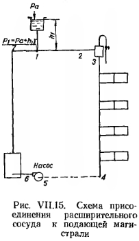ПРИСОЕДИНЕНИЕ РАСШИРИТЕЛЬНОГО СОСУДА К ТРУБОПРОВОДУ СИСТЕМЫ ВОДЯНОГО ОТОПЛЕНИЯ С ИСКУССТВЕННОЙ ЦИРКУЛЯЦИЕЙКак указывалось ранее, расширительный сосуд в насосной системе отопления присоединяется, как правило, к обратной магистрали трубопровода перед всасывающим патрубком циркуляционного насоса. В некоторых случаях, например при обслуживании котельной нескольких систем отопления в отдельных зданиях, расширительный сосуд может быть присоединен к обратному трубопроводу и вне котельной, но с непременным условием, чтобы при выключении отдельных систем отопления он был присоединен к действующей (невыключенной) системе. Место присоединения расширительного сосуда к трубопроводу насосной системы оказывает большое влияние на распределение в ней давления. В любой точке трубопровода системы должно быть избыточное давление (выше атмосферного), так как при несоблюдении этого условия возможно вскипание воды, приводящее к парообразованию, разрыву струи и, следовательно, прекращению нормальной циркуляции воды. ![]() При работе насоса в одной части системы происходит всасывание воды, а в другой — ее нагнетание. Из всех участков трубопровода системы отопления, расположенных между всасывающим патрубком насоса и точкой присоединения расширительного сосуда, вода будет подсасываться, а в остальные участки трубопровода, находящиеся между этой точкой и нагнетательным патрубком насоса,—- нагнетаться. Точка присоединения расширительного сосуда к трубопроводу называется точкой постоянного давления, так как после пуска в действие насоса давление в ней не меняется. Точка p,y°-h4 эта является границей участков, где кончается нагнетание и начинается всасывание. Для установления причины вскипания воды в трубах рассмотрим элементарную схему циркуляционного кольца системы отопления, в котором расширительный сосуд присоединен к подающей магистрали, проложенной на чердаке (рис. VII.15). ![]() Если потеря давления на участке 1-2 будет больше, чем hi у, то давление в точке 2 станет меньше атмосферного давления, т. е. в точке 2 возникнет разрежение, в результате которого вода может закипеть даже при температуре 80—90°С. При более низкой температуре воды парообразования может и не возникнуть, но возможен подсос воздуха из воздухосборников. Подсос воздуха приведет к вытеснению части воды из системы через переливную трубу расширительного сосуда, вследствие чего часть подающей магистрали может оказаться без воды, что нарушит циркуляцию воды в системе. Михайлов Федор Семенович ОТОПЛЕНИЕ И ОСНОВЫ ВЕНТИЛЯЦИИ - М.: Стройиздат, 1972. |