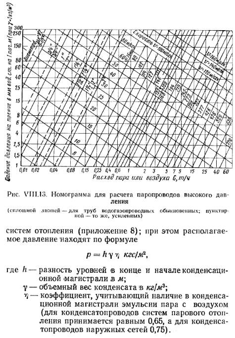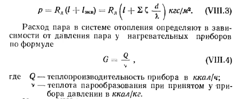 РАСЧЕТ ТРУБОПРОВОДОВ СИСТЕМ ПАРОВОГО ОТОПЛЕНИЯА. Расчет трубопроводов систем парового отопления низкого давления В системах парового отопления как низкого, так и высокого давления расчет паропровода ведется отдельно от расчета конденсатопровода. Расчет паропровода. В системах парового отопления пар движется по паропроводу от котла до нагревательного прибора под действием разности давлений в котле и у нагревательного прибора. Эта разность давлений и является располагаемым давлением, которое расходуется на преодоление сопротивлений в паропроводе между котлом и прибором. Давление пара р кгс/см2 у котла принимается в зависимости от протяженности паропровода I, м: ![]() Для разомкнутой системы парового отопления, часто применяемой для обогрева из одной котельной нескольких зданий, или при питании паром нароводоподогрева- телей и калориферов давление р можно принимать равным 0,5—0,7 кгс/см2. Давление пара перед нагревательным прибором принимают равным 150—200 кгс/м2. Метод расчета паропроводов низкого давления аналогичен методу расчета трубопроводов водяного отопления. При предварительном расчете паропроводов принимают, что на преодоление сопротивлений трения расходуется 65% располагаемого давления. Разделив это давление на длину паропровода от котла до прибора, определяют удельную потерю давления на трение. По величине 7ср и тепловым нагрузкам участков паропровода подбирают их диаметры, соответствующие фактические значения 7 и скорости v в м/сек, пользуясь таблицами приложения 13. Эти таблицы составлены для среднего значения объемного веса пара, поскольку его объемный вес при низких давлениях изменяется в незначительных пределах. Коэффициенты местных сопротивлений для паропроводов принимают, как и для водяного отопления, по приложению 9. Далее подсчитывают потерю давления на преодоление сопротивлений трения 7 на отдельных участках и 27 для всей расчетной ветви паропровода. Потери давления на преодоление местных сопротивлений Z определяют по табл. приложения 14 и затем подсчитывают 2 Z для всей рассчитываемой ветви паропровода. На сопротивления, не учтенные расчетом паропроводов, следует предусматривать запас в размере до 10%. После определения диаметров ветви паропровода с наиболее неблагоприятно расположенным прибором переходят к определению диаметров участков ветвей паропровода других нагревательных приборов. Потери давления во взаимосвязанных частях систем не должны различаться между собой более чем на 25%. Для обеспечения бесшумной работы системы скорости движения пара в трубах не должны превышать величин, приводимых ранее в табл. VII.1. Расчет конденсатопроводов. Диаметры конденсатопроводов подбирают по приложению 15 в зависимости от их длины, количества тепла, выделяемого паром при конденсации, и вида конденсатопровода (сухой, мокрый, вертикальный, горизонтальный). Б. Расчет трубопроводов систем парового отопления высокого давления При движении пара в паропроводах систем парового отопления высокого давления (от котла к месту потребления) его давление, а следовательно, и объемный вес значительно изменяются. Это существенно влияет на потери давления в трубопроводе. Поэтому при расчете паропроводов высокого давления нельзя принимать среднюю величину объемного веса пара по всей длине паропровода, как при ра