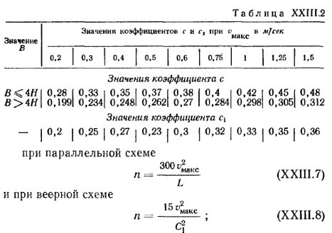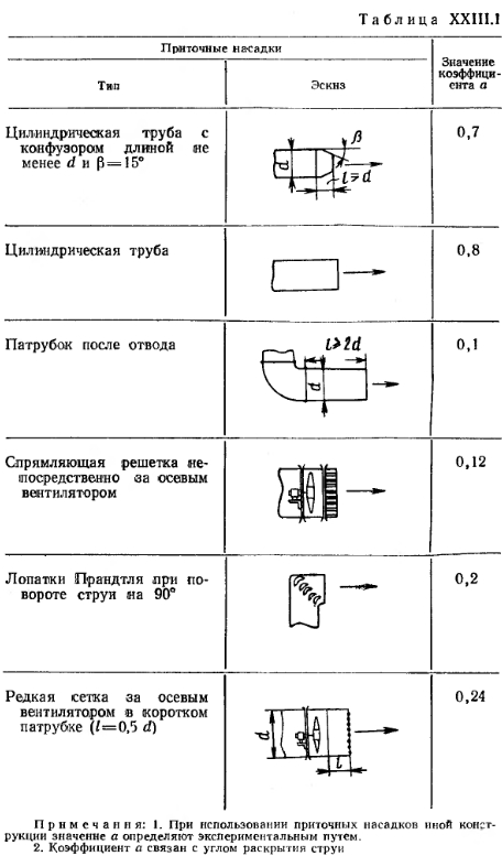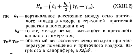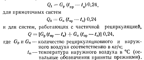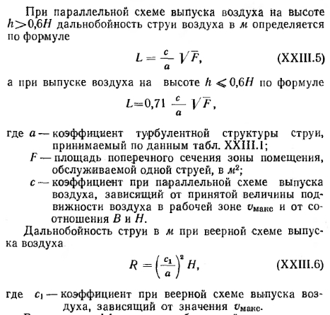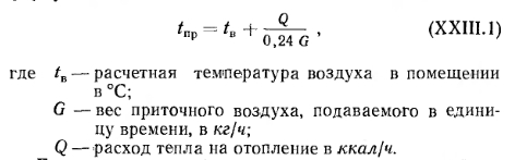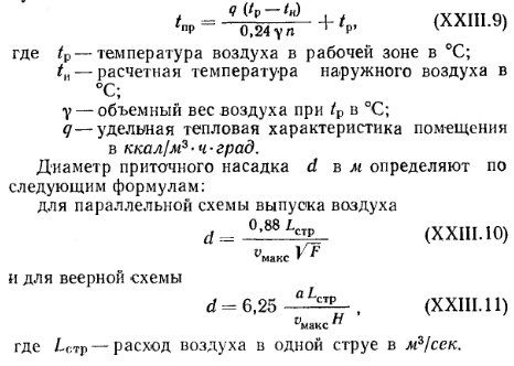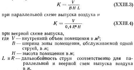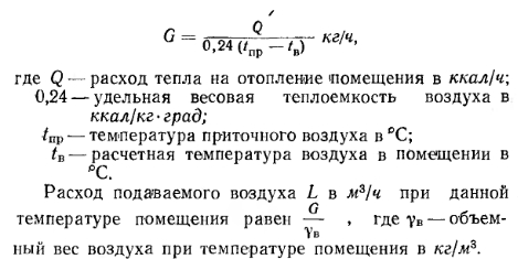 РАСЧЕТ СИСТЕМ ВОЗДУШНОГО ОТОПЛЕНИЯА. Основной способ расчета Вес воздуха G, вводимого за единицу времени в помещение для его отопления, определяется по известной формуле ![]() При определении расчетного количества воздуха для квартир жилых зданий следует исходить из установленных для них норм воздухообмена (см. § 71) с условием удаления воздуха из квартир через вентиляционные системы санузлов и кухонь. Максимальная температура подаваемого в помещение воздуха должна приниматься равной 70°С — при подаче воздуха на высоте более 3,5 м от пола и 45°С—при подаче воздуха на высоте менее 3,5 м от пола и на расстоянии более 2 м от работающего. В централизованных прямоточных и с частичной рециркуляцией воздуха системах воздушного отопления количество вводимого воздуха принимается по требованиям, предъявляемым к вентиляции; при этом температуру приточного (вводимого) воздуха определяют по формуле ![]() Если температура Пр окажется выше допустимой, то для ее снижения следует увеличить количество приточного воздуха. В прямоточных системах отопления с естественным побуждением количество перемещаемого воздуха изменяется в зависимости от наружной температуры. При понижении наружной температуры естественное давление возрастает, в результате чего увеличивается количество поступающего в помещение воздуха; при повышении наружной температуры происходит обратное явление. Расчет воздуховодов систем воздушного отопления ведется по действующему в них давлению. Так, при расчете приточных и вытяжных каналов прямоточных систем отопления с естественным побуждением действующее в них давление определяют по тем же формулам, которые принимаются и для расчета систем приточно-вытяжной вентиляции (см. § 75). Для рециркуляционной системы (рис. XXIII. 1,6) действующее давление Нр в кгс/м2 определяют по формуле ![]() В системах воздушного отопления с механическим побуждением действующее давление принимается равным давлению, развиваемому вентилятором. Определение расхода тепла в системах воздушного отопления. Для систем воздушного отопления, работающих на полной циркуляции, расход тепла в ккал/ч на нагревание воздуха ![]() Методику подбора калориферов, вентиляторов и расчета воздуховодов для систем воздушного отопления см. в § 78 и 82. Б. Расчет системы воздушного отопления с сосредоточенным выпуском воздуха При выборе места выпуска воздуха из отопительных агрегатов следует учитывать, что распространение приточных струй не должно встречать препятствий в виде массивных строительных конструкций и оборудования. Горизонтальное расстояние между препятствиями и местом выпуска воздуха должно быть не меньше удвоенной высоты помещения, при этом выпуск воздуха следует предусматривать выше этих препятствий. Высоту выпуска воздуха h над уровнем пола помещения принимают от 3,5 до 6 м для помещений высотой до 8 л и для помещений большей высоты — от 5 до 7 л. Для регулирования температуры и подвижности воздуха в рабочей зоне приточные отверстия следует снабжать подвижными лопатками, позволяющими изменять направление выпуска воздуха по горизонтали. При определении теплопотерь помещения при воздушном отоплении температуру воздуха под перекрытием следует назначать на 3° выше температуры воздуха в рабочей зоне. Подвижность воздуха в рабочей зоне должна соответствова