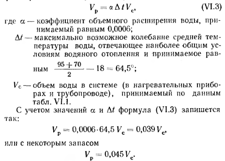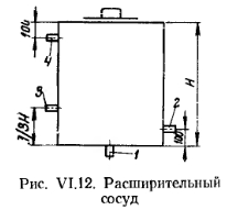 РАСШИРИТЕЛЬНЫЙ СОСУДРасширительный сосуд (рис. VI.12) является, как правило, необходимой принадлежностью каждой системы водяного отопления и служит для восприятия прироста объема воды, образующегося при ее нагревании. Исключением из этого правила являются лишь системы отопления, присоединяемые к тепловодам районных теплоэлектроцентралей (ТЭЦ). В этих системах отопления увеличение объема воды при ее нагревании воспринимается централизованно непосредственно ТЭЦ. ![]() Одновременно в двухтрубных системах водяного отопления с верхней разводкой и в однотрубных системах с естественной циркуляцией воды расширительный сосуд служит также для удаления воздуха из системы. Расширительный сосуд представляет собой металлический резервуар прямоугольной или цилиндрической формы, изготовленный из листовой стали толщиной 4—5 мм. Его устанавливают выше наиболее высокой точки системы (как правило, на чердаке) в месте, наиболее удобном для обслуживания. При отсутствии чердака или при совмещенной крыше расширительный сосуд устанавливают либо на верхней площадке лестничной клетки, либо в утепленной пристройке (будке) на бесчердачном покрытии. Во всех случаях, как правило, расширительный сосуд покрывают тепловой изоляцией. Для присоединения четырех труб [расширительной 1, циркуляционной 2, переливной 4 и сигнальной 3 (на рис. VI.12)] в расширительный резервуар вварено четыре штуцера. Расширительная труба служит для поступления в сосуд прироста объема воды при ее нагревании и одновременно совместно с циркуляционной трубой способствует созданию циркуляции воды в сосуде, что предохраняет его от возможного промерзания. В системах водяного отопления с естественной циркуляцией и верхней разводкой расширительную трубу соединяют с главным стояком, а циркуляционную трубу с ближайшим обратным поэтажным стояком, а в однотрубных системах — с обратной магистралью. Переливная труба, служащая для слива избытков воды при переполнении расширительного сосуда, отводится к раковине в котельной. К. раковине в котельной также отводится сигнальная труба, установленная для наблюдения за уровнем воды в расширительном сосуде. В последнее Время в ряде случаев сигнальную трубу стали заменять электрической поплавковой сигнализацией. Определение объема расширительного сосуда. Объем расширительного сосуда в л определяется по формуле ![]() Диаметры труб, присоединяемых к расширительному сосуду, выбираются в зависимости от его емкости в следующих пределах: расширительная — 32 — 40 мм, циркуляционная— 20—25 мм, сигнальная — 20 мм и переливная — 32—50 мм. ![]() Михайлов Федор Семенович ОТОПЛЕНИЕ И ОСНОВЫ ВЕНТИЛЯЦИИ - М.: Стройиздат, 1972. |