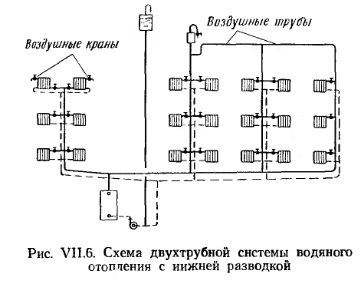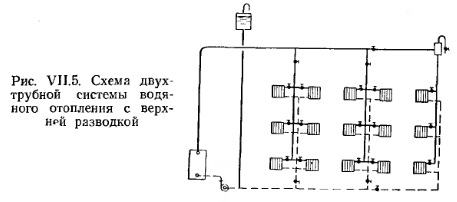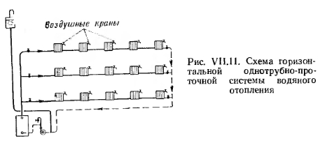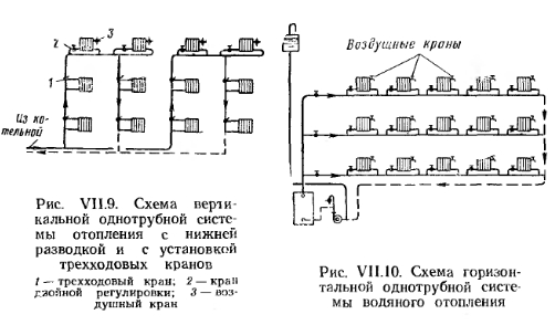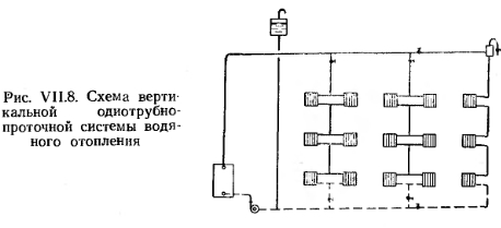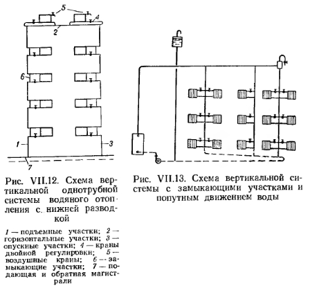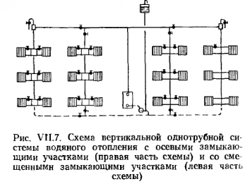 СХЕМЫ СИСТЕМ ВОДЯНОГО ОТОПЛЕНИЯ С ИСКУССТВЕННОЙ ЦИРКУЛЯЦИЕЙБлагодаря значительному давлению, развиваемому насосами, можно использовать любую схему подачи воды от котла к нагревательным приборам и обратно. Следует иметь в виду, что в рассматриваемых системах отопления из-за охлаждения воды в приборах и трубах тоже возникает существенное циркуляционное давление, которое часто приводит к разрегулировке нагревательных приборов. На рис. VII.5 и рис. VII.6 приведены схемы двухтрубных систем с верхней и нижней разводкой трубопроводов. В таких системах под воздействием естественного давления возможна разрегулировка нагревательных приборов. Это происходит из-за того, что при равных длинах циркуляционных колец, проходящих через нагревательные приборы верхнего и нижнего этажей, приборы верхнего этажа располагают большим естественным давлением, чем приборы нижнего. Поэтому количество воды, циркулирующей через приборы верхнего этажа, больше, а в приборах нижнего этажа — меньше расчетного, что вызывает перегрев приборов верхнего и недогрев приборов нижнего этажа. В этом отношении система с нижней разводкой предпочтительнее, так как большая протяженность циркуляционных колец приборов верхних этажей по сравнению с нижними этажами позволяет погашать избыточное давление у приборов верхних этажей и увязывать располагаемое давление в системе по вертикали. ![]() В настоящее время применяется преимущественно насосная двухтрубная система с нижней разводкой трубопроводов (рис. VI 1.6). На рис. VII.7 показана схема вертикальной однотрубной системы отопления с замыкающими участками, при этом в левой части рисунка показаны стояки со смещенным замыкающим участком. Такое смещение замыкающих участков улучшает условия затекания воды в нагревательные приборы, несколько снижает поверхность нагрева последних и обеспечивает более надежную компенсацию удлинений стояков при их нагревании. ![]() ![]() Однотрубные системы водяного отопления с прямыми замыкающими участками имеют высокие технико-экономические показатели и в соответствии со СНиП применяются во всех жилых и общественных многоэтажных зданиях (более трех этажей). В вертикальной однотрубной проточной системе отопления с верхней разводкой (рис. VII.8) вода, поступающая в стояк, проходит последовательно через все отопительные приборы стояка. Отсутствие регулирующих кранов надежной конструкции не позволяет полностью выключать и надлежащим образом регулировать отдельные приборы в этой системе. Регулировать теплоотдачу нагревательных приборов можно лишь вентилями, установленными на стояках. Влияние естественного давления на теплоотдачу нагревательных приборов одинаково по всем этажам. ![]() Из всех существующих радиаторных систем эта система наиболее экономична и обладает высокой гидравлической и тепловой устойчивостью. Монтаж ее прост. На устройство системы требуется наименьшее количество труб, фасонных частей и нагревательных приборов. На рис. VII.9 изображена однотрубная вертикальная система с нижней разводкой и установкой трехходовых кранов для регулировки теплоотдачи приборов. С помощью такого крана можно уменьшать количество воды, поступающей в прибор, и одновременно с этим увеличивать расход воды по замыкающему участку, и наоборот. При крайних положениях трехходового крана 