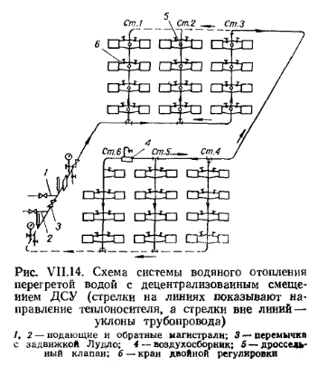 При тупиковой разводке длина циркуляционных колец неодинакова, и чем дальше расположен нагревательный прибор от котла или теплового ввода ТЭЦ, тем длиннее циркуляционное кольцо. При расчете трубопроводов насосных систем отопления с тупиковой разводкой во многих случаях не удается достичь равенства потерь давления в коротких и длинных кольцах, что является причиной неравномерного прогрева приборов, поскольку через короткие кольца воды проходит больше, чем через длинные. В соответствии с этим близко расположенные к котлу приборы перегреваются, а приборы, удаленные от котла, бывают слабо прогретыми. Нормального прогрева приборов в тупиковых системах можно добиться путем длительной и кропотливой регулировки системы, с искусственным введением в короткие кольца местных сопротивлений. Для упрощения регулировки насосных систем водяного отопления проф. В. М. Чаплин предложил схему с попутным движением воды (рис. VII.13). Особенностью этой системы является равенство длин всех циркуляционных колец в системе отопления. Следует, правда, отметить, что по сравнению с тупиковой система с попутным движением воды требует большего количества труб как по протяженности, так и по весу. В этой системе для горячих и обратных магистралей приходится применять трубы больших диаметров, в силу чего первоначальная стоимость системы отопления с попутным движением воды превышает стоимость системы с тупиковой разводкой магистральных трубопроводов. Системы с попутным движением воды применяют в основном для зданий большой протяженности. Система отопления перегретой водой с децентрализованным смешением (системы ДСЧ). В 1948 г. инж. И. Е. Чечик предложил систему отопления перегретой водой с децентрализованным смешением. Особенность этой системы заключается в том, что она делится на две части (рис. VII.14), в первой из которых стояки (на рисунке сокращенно Ст. 1, Ст. 2 и Ст. 3) во всех случаях выполняются однотрубными с замыкающими участками, а во второй (Ст.4, Ст.5 и Ст.6) — как однотрубными, так и двухтрубными. Перегретая вода поступает в первую часть системы, где она циркулирует но стоякам и нагревательным приборам снизу вверх. Благодаря этому температура поверхности нагревательных приборов в этой части системы не превышает 95°С; при этом питание водой снизу вверх обеспечивает в общем равномерный прогрев поверхности нагревательного прибора. Как показывает практика, температуры в отдельных точках поверхности радиатора со строительной высотой 500 мм различаются в большинстве случаев не более чем на 5—6°, а средняя температура поверхности радиатора примерно равна температуре воды, выходящей из прибора. ![]() Для обеспечения затекания воды в нагревательные приборы на замыкающих участках стояков первой части системы устанавливают дроссельные шайбы. Минимальный диаметр отверстия в такой шайбе равен 7 мм. Общая обратная линия от стояков с циркуляцией снизу вверх прокладывается, как правило, по чердаку; продолжение этой линии служит подающей магистралью для стояков второй части системы, действующей по обычному принципу, т. е. с циркуляцией воды сверху вниз. Разводку магистральных трубопроводов в этой системе выполняют, как правило, с попутным движением воды. В связи с повышенной температурой воды в трубопроводах стояки и подводки к приборам в первой части систе