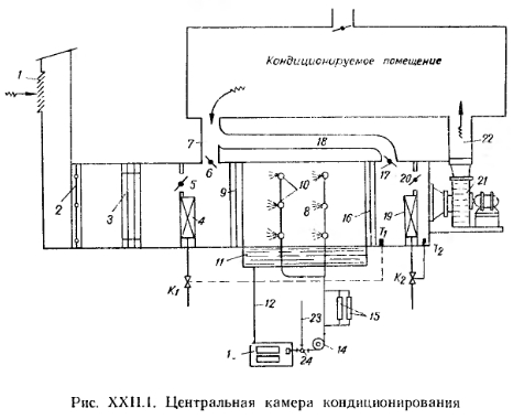 СИСТЕМЫ ЦЕНТРАЛЬНОГО КОНДИЦИОНИРОВАНИЯ ВОЗДУХАНаибольшее применение получили системы центрального кондиционирования с обработкой воздуха в так называемом форсуночном кондиционере. В форсуночном кондиционере, так же как и в контактном воздухобхладителе, имеется оросительная камера с распыливающими воду форсунками. Воздух, проходя через дождевое пространство оросительной камеры, соприкасается с каплями распыленной воды и увлажняется. По степени использования рециркуляционного воздуха центральные системы подразделяются на прямоточные, обрабатывающие лишь наружный воздух, и на работающие с рециркуляцией, т. е. с подмешиванием внутреннего воздуха к наружному воздуху до его увлажнения и после увлажнения. На рис. XXII. 1 показана общая схема форсуночного кондиционера с двумя рециркуляциями воздуха. Наружный воздух через жалюзи 1 воздухозаборного устройства и утепленный клапан 2 поступает на воздушный фильтр 3, где очищается от пыли. Далее, в зимний период времени воздух нагревается в калориферах первого подогрева 4, которые имеют обводный канал с клапаном 5 для пропуска воздуха помимо калорифера. К подогретому наружному воздуху при открытом дроссель-клапане 6 подмешивается воздух, поступающий из кондицируемого помещения, т. е. происходит первая рециркуляция 7. Для выравнивания воздушного потока и во избежание выхода водяных капель из оросительной камеры 8 служит сепаратор (каплеотделитель) 9. Для распыления воды в камере используются форсунки 10. Разбрызгиваемая вода собирается в поддоне 11, расположенном в нижней части оросительной камеры. Поддон соединен сливной трубой 12 с водяным фильтром 13. Из водяного фильтра вода забирается насосом 14 и, пройдя дополнительную очистку иа бутылочных фильтpax 15, поступает опять в форсунки. После оросительной камеры и второго сепаратора 16 к увлажненному воздуху при открытом дроссель-клапане 17 снова подмешивается воздух, поступающий из обслуживаемого помещения, т. е. происходит вторая рециркуляция 18. Далее воздух вторично нагревается калориферами второго нагрева 19, имеющими обводной клапан 20, а затем поступает к вентилятору 21, которым подается через распределительный воздуховод 22 в кондиционируемое помещение. ![]() Летом калориферы первого и второго нагрева, как правило, не работают, но в отдельных случаях калориферы второго нагрева могут быть использованы для подогревания воздуха, сильно охлажденного после прохода через оросительную камеру. В этот период к форсункам оросительной камеры по трубопроводу 23 от холодильной установки подается охлажденная вода, имеющая температуру ниже температуры точки росы обрабатываемого воздуха. Таким образом осуществляется не только охлаждение, но и осушка воздуха. Температуру поступающей в форсунки воды изменяют путем смешения воды, поступающей от холодильной установки, с водой, поступающей из поддана оросительной камеры после ее очистки на фильтрах. Поступление той или другой воды регулируется трехходовым краном 24. Для других систем кондиционирования воздуха — прямоточных и с одной рециркуляцией воздуха — рассмотренная схема кондиционирования в принципе сохраняется, но в прямоточной системе будут отсутствовать первая и вторая рециркуляции воздуха, а в системах с одной рециркуляцией сохранится лишь одно первое поступление внутреннего 