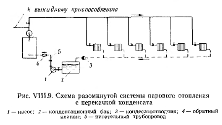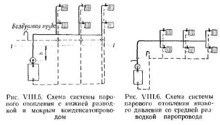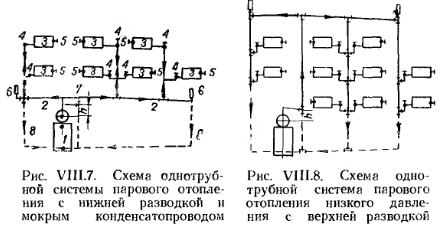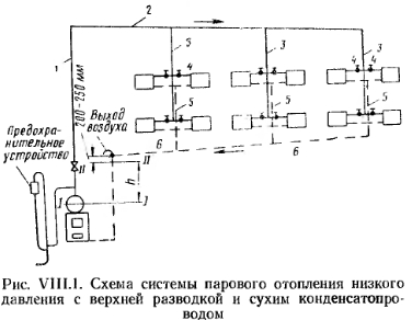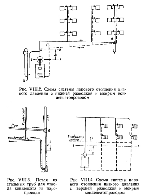 СИСТЕМЫ ПАРОВОГО ОТОПЛЕНИЯ НИЗКОГО ДАВЛЕНИЯСистема отопления с верхней разводкой и самотечным возвратом конденсата в котел (с сухим конденсатопроводом). Из схемы, показанной на рис. VIII.1, видно что под действием разности давлений в котле и нагревательных приборах пар из котла поднимается по главному стояку 1 в магистральный паропровод 2 и далее по паровым стоякам 3 и ответвлениям 4, на которых установлены паровые вентили, поступает в нагревательные приборы. В нагревательных приборах пар конденсируется, отдавая тепло через стенки прибора отапливаемому помещению. Образующийся при этом конденсат по конденсационным стоякам 5 и сборному конденсатопроводу 6, прокладываемому с уклоном в направлении его движения, самотеком возвращается в котел. Как видно из схемы, котел расположен значительно ниже нагревательных приборов, чтобы столб конденсата между сечениями I—I и II—II высотой h уравновешивал давление пара в котле. Так, при давлении пара 0,2 ати высота столба конденсата должна быть равна 2 м. Точка присоединения воздушной трубки в конденсатопроводу должна лежать выше уровня воды II—II не меньше чем на 200 мм. При этом условии конденсатопровод не будет полностью заполняться водой. ![]() Система отопления с нижней разводкой и самотечным возвратом конденсата. Схема, приведенная на рис. VIII. 2, отличается от предыдущей лишь положением магистрального паропровода. Для отвода конденсата из магистрального паропровода конец последнего соединен в точке а с конденсатопроводом петлей (рис. VIII.3.). Петля служит водяным затвором, препятствующим прониканию пара в конденсатопровод. При работе системы под влиянием давления пара вода в петле будет находиться на разных уровнях; разность этих уровней h уравновесит давление пара в точке присоединения петли к магистральному паропроводу. В нижней точке петли имеется тройник с пробкой I, которая служит для спуска воды и прочистки петли. Непосредственное присоединение паровой магистрали к конденсатопроводу (без петли) привело бы к прорыву пара в конденсационную магистраль и гидравлическим ударам. ![]() Система отопления с верхней разводкой пара и мокрым конденсатопроводом (рис. VIII. 4). При работе системы вода под давлением пара доходит в конденсационных стояках до уровня, вследствие чего конденсационная магистраль полностью заливается водой. Для отвода воздуха из системы прокладывают воздушную линию, к которой выше уровня присоединены все конденсационные стояки. Система отопления с нижней разводкой пара и мокрым конденсатопроводом (рис. VIII. 5). В отличие от системы отопления с нижним распределением пара и с сухим конденсатопроводом, схема которой показана на рис. VIII.2, в рассматриваемой системе нет необходимости устраивать для отвода конденсата петли, так как каждый стояк, заполненный конденсатом до уровня, являлся гидравлическим затвором, препятствующим поступлению пара в конденсационную магистраль. ![]() Система отопления со средней разводкой пара. В этой системе (рис. VIII. 6) паровая магистраль прокладывается под потолком одного из этажей. Часть системы, расположенная выше паровой магистрали, является той же системой с нижней разводкой, которая изображена на рис. VIII. 2. Другая ее часть, расположенная ниже паровой магистрали, аналогична системе с верхней разводкой, изображенной на рис. VIII. 1. Вертикальные од