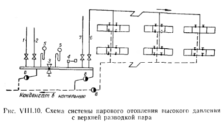 СИСТЕМЫ ПАРОВОГО ОТОПЛЕНИЯ ВЫСОКОГО ДАВЛЕНИЯПар высокого давления используется как теплоноситель для систем отопления и вентиляции производственных и вспомогательных зданий, если он вырабатывается в заводских котельных для нужд производства. Кроме того, пар высокого давления находит применение для передачи тепла на большие расстояния. На рис. VIII.10 показана схема тупиковой системы парового отопления высокого давления с верхней разводкой пара. По этой схеме пар с давлением, необходимым для производственных нужд, подается из заводской котельной по паропроводу 1 к парораспределительной гребенке, от которой он направляется по трубопроводу 2 в цехи. Если из котельной пар поступает под давлением большим, чем это нужно для отопления и вентиляции, то для снижения давления на паропроводе к этим системам устанавливают редукционный клапан 3, а после него предохранительный клапан 4. При неисправности редукционного клапана открывается предохранительный клапан, отрегулированный на давление, необходимое для целей отопления, и давление в паропроводе понизится. Для измерения давления пара до и после редукционного клапана устанавливают манометры 5. ![]() От распределительной гребенки по трубопроводу 6 пар поступает к системам отопления, а по трубопроводу 7 — к калориферам приточной вентиляции. В системе парового отопления пар подается по магистральному паропроводу и стоякам к нагревательным приборам, на паровых и конденсационных подводках которых установлены паровые вентили для включения и выключения приборов. При установке вентиля только на паровой подводке прибор выключить нельзя, так как при закрытом вентиле пар будет поступать в прибор конденсационной магистрали. Для компенсации температурных удлинений паропровода и конденсационной магистрали устанавливают компенсаторы. Образующийся в паропроводах конденсат удаляется через конденсатоотводчики 8. Кроме тупиковой схемы разводки трубопровода, показанной на рис. VIII.10, в ряде случаев в системах парового отопления высокого давления применяют и схему разводки трубопроводов с попутным движением пара и конденсата. При такой схеме исключается возможность попадания пара из ближайших к котлу приборов в конденсатопровод и образования в нем подпора конденсата, поступающего из дальних нагревательных приборов. Системы парового отопления высокого давления, так же как и системы низкого давления, могут быть с нижней и средней разводкой пара. Михайлов Федор Семенович ОТОПЛЕНИЕ И ОСНОВЫ ВЕНТИЛЯЦИИ - М.: Стройиздат, 1972. |