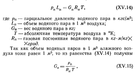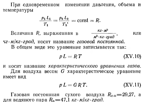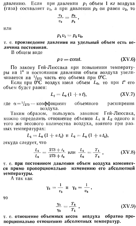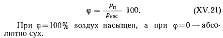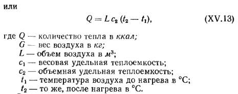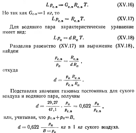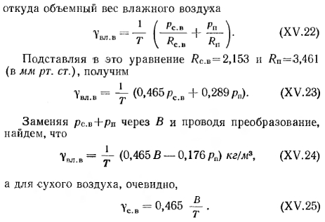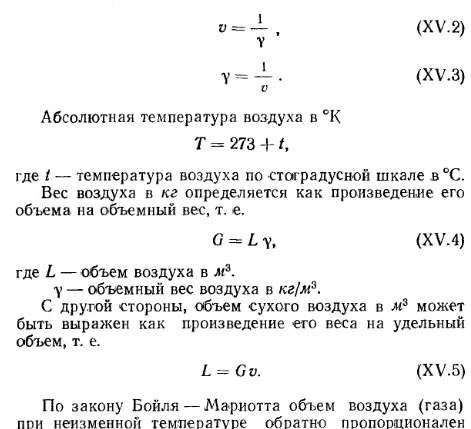 СОСТАВ И ФИЗИЧЕСКИЕ СВОЙСТВА ВОЗДУХА. ПРОЦЕССЫ ИЗМЕНЕНИЯ ЕГО СОСТОЯНИЯСухой атмосферный воздух является смесью нескольких газов и содержит по объему 21 % кислорода, 78% азота, 0,95% аргона, 0,03% углекислоты и другие газы (например, гелий, неон и пр.). В качестве примесей природный атмосферный воздух содержит также небольшое количество водяных паров, т. е. может иметь разную влажность. Содержание водяного пара в воздухе изменяется и зависит от температуры последнего. Для технических расчетов можно считать, что влажный воздух в пределах от —30 до 150°С подчиняется законам идеального (однородного) газа. К основным параметрам, характеризующим физические свойства воздуха, относятся его удельный и объемный вес, теплоемкость, влагосодержание, теплосодержание, давление и температура. Давление воздуха. Атмосферное давление воздуха В обычно называют барометрическим. По закону Дальтона атмосферное давление состоит из давления сухого воздуха и давления водяных паров, т. е. ![]() На уровне моря атмосферное давление в среднем равно 760 мм рт. ст. С повышением уровня местности оно падает. Для средней полосы европейской части СССР атмосферное давление составляет в среднем 745 мм рт. ст. Обычно для практических расчетов принимают техническую атмосферу, которая равна 1 кгс/см2. В отопительно-вентиляционной технике приходится иметь дело с относительно небольшими давлениями, и за единицу измерения давления принимается давление 1 кгс/м2, т. е. 0,0001 ати. Давление 1 кгс/м2 соответствует напору 1 мм вод. ст. Процессы изменения состояния воздуха. Состояние сухого воздуха определяется давлением В, кгс/м2-, удельным объемом v, м3/кг, объемным весом у, кгс/м3 и абсолютной температурой Т в °К (по шкале Кельвина). Удельным объемом называется объем единицы веса воздуха, а обратная ему величина представляет собой объемный (удельный) вес воздуха, т. е. ![]() ![]() ![]() Теплоемкость воздуха. Различают удельную весовую и удельную объемную теплоемкости. Весовой удельной теплоемкостью св называют количество тепла, необходимое для того, чтобы 1 кг воздуха нагреть на 1°; для вентиляционных расчетов принимают св=0,24 ккал/кг-град. Объемной удельной теплоемкостью с0 называют количество тепла, которое необходимо для того, чтобы 1 ж3 воздуха нагреть на 1°. При /=0°С и барометрическом давлении В=745 мм вод. ст. со=0,31 ккал/м3-град. С изменением температуры и давления объемная теплоемкость меняется пропорционально объемному весу воздуха. Поэтому при определении расходов тепла на подогрев воздуха точнее пользоваться весовой удельной теплоемкостью. Весовая удельная теплоемкость водяных паров, содержащихся во влажном воздухе, еп=0,43 ккал/кг-град, откуда ясно, что удельная весовая теплоемкость влажного воздуха выше, чем сухого. Несмотря на это, при вентиляционных расчетах принимают во внимание, как правило, весовую удельную теплоемкость сухого воздуха, т. е. с =0,24 ккал/кг-град. Количество тепла, необходимого для подогрева воздуха, определяют по формулам: ![]() ![]() Влажность воздуха. Как указывалось ранее, в атмосферном воздухе всегда содержится некоторое количество водяных паров. Влажный воздух может находиться в насыщенном и ненасыщенном состояниях. Влажный воздух, содержащий максимальное количество водяных паров при данной температуре, называют насыщенным. Воздух, в котором содержится не максимально возм