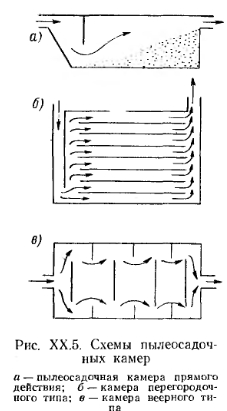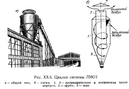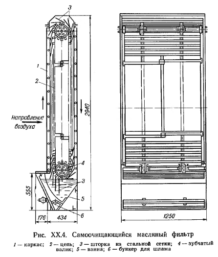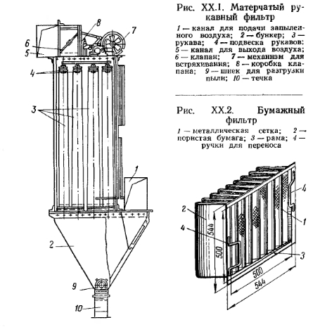СПОСОБЫ ОЧИСТКИ ВОЗДУХАОчистке от пыли подвергается вводимый в помещение наружный воздух, если концентрация пыли в нем больше допускаемой нормами; внутренний воздух, если он в целях экономии расхода тепла подмешивается к наружному приточному воздуху, и внутренний воздух, удаляемый в атмосферу. Подаваемый в помещение воздух после смешения наружного и внутреннего воздуха, а также внутренний воздух, удаляемый наружу, не должны содержать пыли в концентрации более 30% ее предельно допустимого значения. Степень очистки (воздуха характеризуется конечным содержанием в нем пыли. Очистка воздуха от пыли подразделяется на грубую, среднюю и тонкую. При грубой очистке задерживаются частицы пыли размером более 100 мк, при средней — до 100 мк (при конечном содержании пыли в воздухе 100 мг/м3). Тонкая очистка обеспечивает конечное содержание пыли в воздухе 1—2 мг/м3. Все устройства для очистки воздуха от пыли подразделяются на фильтры и пылеотделители. В фильтре запыленный воздух очищается, проходя через сетчатые и пористые материалы (ткань, металлические сетки, пористую бумагу, гравий и пр.). В пылеотделителях очистка воздуха от пыли основана на использовании силы тяжести и центробежной силы. Кроме того, в отдельных случаях находят применение электрофильтры и ультразвуковые пылеуловители. Принцип действия электрофильтров основан на том, что частицы пыли, проходя вместе с воздухом через электрическое поле, получают заряд электричества, притягиваются к электродам и оседают на их поверхностях. С электродов частицы пыли удаляют механическим способом. В ультразвуковых пылеуловителях используется способность частиц пыли свертываться в хлопья под действием ультразвуковых волн, создаваемых сиреной. Хлопья выпадают в бункер пылеуловителя. Устройства по очистке -воздуха от пыли могут быть сухими и мокрыми. В мокрых устройствах для смачивания пыли применяются вода и масло. К ним относятся орошаемые и масляные фильтры. Применение мокрых пылеуловителей повышает эффект очистки воздуха. Фильтры. Фильтры используются для тонкой очистки запыленного воздуха и находят применение в системах приточной и вытяжной вентиляции для фильтрации наружного воздуха, внутреннего воздуха при его рециркуляции, а также и при удалении запыленного воздуха в атмосферу. В вентиляционной технике наибольшее применение получили матерчатые, бумажные и масляные фильтры. Матерчатые (тканевые) фильтры бывают рукавными и рамочными. В рукавных фильтрах запыленный воздух проходит через тканевые рукава цилиндрической формы, а в рамочных — через набор плоских тканевых рамок, на которых оседают частицы пыли. Пыль в матерчатых фильтрах отделяется от очищаемого воздуха при прохождении его через пористую ткань (шерстяную или хлопчатобумажную). В основной своей массе частицы осаждаются на лицевой стороне ткани, а часть частиц проникает в толщу ткани, где задерживается между нитями и ворсом. Ворсистые шерстяные ткани лучше задерживают пыль, чем хлопчатобумажные, а потому они предпочтительней. ![]() На рис. XX. 1 показан матерчатый рукавный фильтр. Запыленный воздух подается по воздуховоду в бункер фильтра и далее поступает в его рукава. Пройдя через ткань рукавов, уже очищенный воздух направляется к выходному патрубку фильтра и далее к приемному воздуховоду вентилятора. Фильтр 