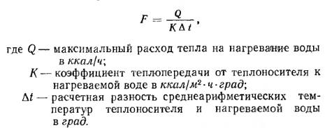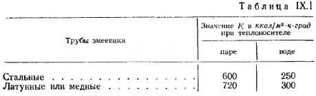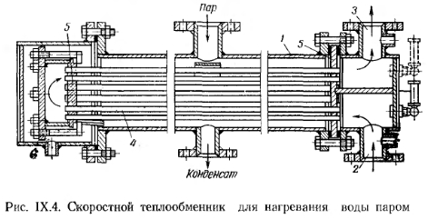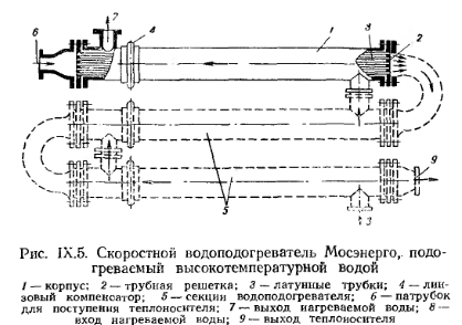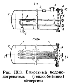ТЕПЛООБМЕННЫЕ АППАРАТЫ (ВОДОНАГРЕВАТЕЛИ)Водоподогреватели бывают емкостные и скоростные. На рис. IX.3 показан емкостный водоподогреватель «Энергия». Он состоит из цилиндрического корпуса 1, к которому с одной стороны приварено днище 2, а с другой имеется разъемная крышка 3, которая крепится к нему болтовым фланцевым соединением с прокладкой из листового паронита или термостойкой резины. В корпус вставлен змеевик 4 из стальных труб, концы которых вварены в нижний и верхний коллекторы 5. В коллектор вварены также патрубки 6, соединяющие змеевик с котлом. Через верхний патрубок в змеевик водоподагревателя поступает пар, а через нижний отводится конденсат. ![]() Нагреваемая вода из системы отопления поступает в водоподогреватель через патрубок 7, а нагретая вода уходит из водоподогревателя в систему через патрубок 8. На водоподогревателе устанавливается предохранительный клапан (место 9), манометр 10 и термометр, муфта для которого вваривается в верхнюю часть корпуса. Эти водоподогреватели благодаря большому объему находящейся в них воды могут аккумулировать значительное количество тепла, что позволяет подавать в водоподогреватель пар с перерывами. Так как нагреваемая вода проходит через водоподогреватель с малой скоростью, то коэффициент теплопередачи от теплоносителя к воде через стенки труб змеевика сравнительно невелик. Водоподогреватели типа «Энергия» отличаются незначительным сопротивлением движению через них воды, а потому могут применяться для систем водяного отопления с естественной циркуляцией. Большие габаритные размеры емкостных водоподог- ревателей являются их существенным недостатком. Даже для сравнительно небольшой системы отопления, обслуживающей здание объемом 10 тыс. м3, потребуется водоподогреватель диаметром 1,5 и длиной 3,5 м. Значительно меньшие габаритные размеры имеют скоростные водоподогреватели с малым объемом воды, в которых нагреваемая вода движется по трубкам с большой скоростью, а теплоноситель подается в меж- дутрубное пространство водоподогревателя. На рис. IX.4 показан скоростной теплообменнник для нагревания воды паром. Он состоит из цилиндрического металлического корпуса 1, патрубка для входа воды 2, патрубка для выхода нагретой воды 3, пучка стальных прямолинейных трубок 4, расположенных внутри корпуса. Трубки ввальцовываются в две трубные решетки 5 и своими концами выходят в переднюю и заднюю камеры. Конструкция теплообменника разборная. ![]() Благодаря большой скорости движения воды в трубах (до 2,5 м1сек) коэффициент теплопередачи этих водоподогревателей значительно выше, чем у емкостных. Прямолинейность трубок обеспечивает удобство их очистки от оседающей внутри накипи. В скоростном водоподогревателе конструкции Мосэнерго (рис. IX.5) вода для системы отопления подогревается высокотемпературной водой. В нем нагреваемая вода проходит в междутрубном пространстве, а высокотемпературная вода —по трубам водоподогревателя. ![]() Расчетная поверхность нагрева емкостных теплообменников в м2 определяется по формуле ![]() Коэффициент теплопередачи змеевика принимают по данным табл. IX. 1 ![]() Расчет скоростных теплообменников рассматривается в специальных курсах по теплоснабжению, например в книге Ю. Л. Гусева и С. Ф. Копьева «Котельные установки и тепловые сети». Гоостройиздат, 1962 г. Михайлов