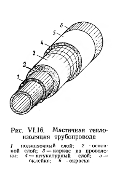 ТЕПЛОВАЯ ИЗОЛЯЦИЯ ТРУБОПРОВОДОВТепловая изоляция трубопроводов системы отопле ния при прокладке их в неотапливаемых помещениях, а также в подпольных и подземных каналах предохраняет трубопроводы от промерзания и уменьшает их непроизводительные теплопотери. Существует ряд способов изоляции трубопроводов, но для трубопроводов систем отопления наиболее часто применяются мастичная, формовочная (из отдельных скорлуп—сегментов) и оберточная (из минеральной ваты, войлока, асбестового шнура и др.) изоляция. Для простейшего вида мастичной изоляции мастика изготовляется из 70—80% (по весу) гжельской огнеупорной глины, замешанной с 20—30% шерстяных очесов. Такую мастику набрасывают на горячую поверхность трубопровода двумя слоями по 25 мм каждый, при этом второй слой набрасывают только после высыхания первого. После просушки слоев изоляционную поверхность штукатурят той же мастикой, но более густым замесом, слоем 5—6 мм, что повышает механическую прочность изоляции. Если конструкция с изоляцией предназначена для размещения в местах с повышенной влажностью воздуха, в слой штукатурки добавляют некоторые водонепроницаемые материалы (например, цемент с церезитом) или поверхность изоляции покрывают мешковиной и окрашивают масляной краской. Для повышения коэффициента полезного действия мастичной изоляции мастику изготовляют из материалов с малым коэффициентом теплопроводности таких, как совелит, ньювель, а для усиления ее конструктивной прочности на второй слой (основной) накладывают металлический каркас из проволоки. При температуре теплоносителя свыше 100°С на поверхность трубопровода вначале наносят термоизоляционный слой толщиной б—10 мм из асбозурита или асбеста, после чего накладывают мастичную изоляцию. На рис. VI.16 показана одна из конструкций мастичной теплоизоляции, которая нашла наибольшее распространение в практике. ![]() Основное преимущество мастичной теплоизоляции состоит в монолитности и возможности наносить ее на поверхность любого очертания (трубы, котлы, теплообменники и др.). Существенным недостатком этого вида изоляции является то, что мастичную теплоизоляцию можно наносить только на горячий трубопровод и чередующимися слоями, с просушкой предудущего слоя. Формовочная теплоизоляция состоит из отдельных скорлуп-сегментов, равных 7e—Vio части окружности, которыми изолируют холодные поверхности трубопроводов, что является большим ее преимуществом. Предварительно до укладки сегментов поверхность трубопровода очищают и промазывают мастикой, изготовленной из тех же материалов, из которых изготовлены сигменты-скорлупы. Скорлупы перед соединением друг с другом промазывают той же мастикой и закрепляют вязальной проволокой—по два кольца на сегмент. При формовочной изоляции в два слоя швы между сегментами укладывают вразбежку. По верху формовочной изоляции накладывают изоляционный слой толщиной 5—7 мм , служащий для выравнивания поверхности формовочной изоляции. После этого, как и при мастичной изоляции, поверхность изоляции покрывают мешковиной и окрашивают масляной краской. Оберточная изоляция чаще применяется в виде матов, изготовленных из минеральной ваты. Маты укладывают по верху трубопровода таким образом, чтобы их горизонтальные швы находились сбоку труб. На стыках поперечные и продольны