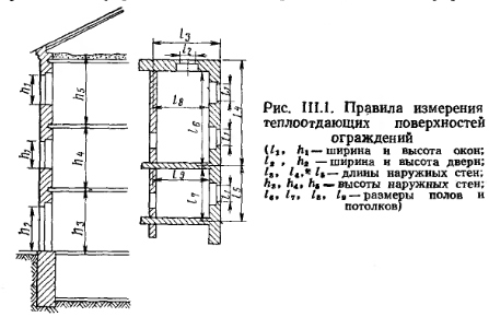 ИЗМЕРЕНИЕ ОГРАЖДАЮЩИХ ПОВЕРХНОСТЕЙ ЗДАНИЙПлощади поверхностей F м2 наружных ограждений зданий при подсчете потерь тепла измеряют по планам и разрезам здания (см. рис. III.1) следующим образом: 1) поверхность потолков и полов — по размерам между осями внутренних стен и по расстоянию от внутренних поверхностей наружных стен до осей внутренних стен; ![]() 2) высоту стен первого этажа — по расстоянию от уровня чистого пола первого этажа до уровня чистого пола второго этажа, если пол расположен непосредственно на грунте; по расстоянию от уровня подготовки первого этажа до уровня чистого пола второго этажа, если пол на латах; по расстоянию от уровня нижней поверхности конструкции пола первого этажа до уровня чистого пола второго этажа, если имеется неотапливаемый подвал или подполье; 3) высоту стен промежуточного этажа — по расстоянию между уровнями чистых полов данного и лежащего выше этажей; 4) высоту стен верхнего этажа (или одноэтажного здания) с бесчердачным покрытием — по расстоянию от уровня чистого пола до пересечения внутреннего обреза стены с верхней плоскостью бесчердачного покрытия; 5) высоту стен верхнего этажа с чердачным покрытием — по расстоянию от уровня чистого пола до верха утепляющего слоя чердачного перекрытия; 6) длину наружных стен неугловых помещений — по расстоянию между осями внутренних стен, а угловых помещений — от внешних поверхностей до осей внутренних -стен; 7) длину внутренних стен — по расстоянию от внутренних поверхностей наружных стен до осей внутренних стен или по расстоянию между осями внутренних стен; 8) поверхность окон, дверей и фонарей — по наименьшим размерам проемов в свету. При обмере ограждений допускается принимать линейные размеры с точностью до 0,1 м, а размеры площади — с точностью до 0,1 м2. Михайлов Федор Семенович ОТОПЛЕНИЕ И ОСНОВЫ ВЕНТИЛЯЦИИ - М.: Стройиздат, 1972. |