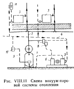 ВАКУУМ-ПАРОВОЕ ОТОПЛЕНИЕСущественным недостатком систем парового отопления как низкого, так и высокого давления является ограниченность их применения. Органическая пыль, осаждающаяся на горячих поверхностях нагревательных приборов этих систем с высокой температурой (выше 100°С), пригорает и, разлагаясь, выделяет специфический неприятный запах. Этот недостаток исключается в так называемых вакуум-паровых системах, в которых температура на поверхностях нагревательных приборов всегда ниже lOOt. В вакуум-паровой системе использовано свойство насыщенного пара снижать температуру при понижении его давления. Возможность поддержания температуры ниже 100°С на поверхностях нагревательных приборов объясняется созданием в системе вакуума (давления меньше атмосферного) при помощи вакуум-насоса, отсасывающего конденсат из системы и нагнетающего его в котел. На рис. VIII.11 приведена схема вакуум-паровой системы отопления, в которой вакуум создается в приборах, конденсатопроводе, котле и паропроводах. Пар из котла 1 по паропроводу 2 поступает в нагревательные приборы 3. Конденсат попадает в котел по трубопроводу 4. Разность давлений в котле и конденсационной магистрали создается вакуум-насосом 5, соединенным с электродвигателем 6. Для включения и выключения насоса служат автоматический мембранный регулятор 7 и рубильник 8. Мембранный регулятор соединен с котлом и конденсатопроводом. Интенсивность горения топлива, а следовательно, и паропроизводительность котла регулируется поддувальной дверцей, управляемой цепочкой 9 и автоматом 10, работающим от термостата 11. ![]() На паровой подводке к каждому прибору установлен вентиль, а на конденсационной подводке — конденсатоотводчик термического действия, который пропускает воду и воздух, но задерживает пар. Во избежание подсоса воздуха монтаж таких систем должен быть выполнен тщательно, с обеспечением надлежащей герметичности соединений. Вакуум-паровые системы находят применение за рубежом для отопления высотных зданий, к которым предъявляются повышенные гигиенические требования. Для вакуум-паровых систем применяются облегченные нагревательные приборы. Михайлов Федор Семенович ОТОПЛЕНИЕ И ОСНОВЫ ВЕНТИЛЯЦИИ - М.: Стройиздат, 1972. |