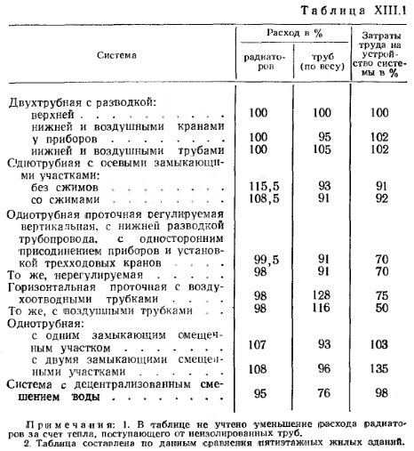 ВЫБОР СИСТЕМ ОТОПЛЕНИЯТребования, предъявляемые к системам центрального отопления. Каждая система центрального отопления должна удовлетворять санитарно-гигиеническим и экономическим требованиям, быть простой и надежной в действии. Санитарно-гигиенические требования, предъявляемые к системам центрального отопления, сводятся к обеспечению в отапливаемом помещении по его площади и высоте равномерной температуры воздуха и к поддержанию на поверхностях нагревательных приборов температуры, исключающей возможность пригорания пыли. Колебания температуры в отапливаемых помешениях вредно отражаются на самочувствии людей и могут приводить к простудным заболеваниям. Поэтому для каждого помещения, в зависимости от его назначения, установлены необходимые температуры воздуха. Экономические требования заключаются в том, чтобы стоимость устройства системы и ее эксплуатации была наименьшей Необходимо также, чтобы устройство системы отопления требовало минимального расхода металла и наименьших затрат труда. Выбор того или иного вида системы отопления и теплоносителя к ней зависит от назначения помещений здания, режима их эксплуатации и регламентируется советским законодательством, приведенным в СНиП П-Г.7-62 «Отопление, вентиляция и кондиционирование воздуха». Как правило, системы центрального отопления устраивают во всех зданиях (независимо от их объема и этажности), если они расположены вблизи тепловых сетей ТЭЦ или районной котельной. При отсутствии таких теплосетей вопрос об устройстве центрального отопления в жилых и общественных зданиях решается в зависимости от их назначения, объема и этажности. В производственных помещениях системы центрального отопления применяются независимо от высоты (этажности) здания и, как правило, с использованием пара или горячей воды, вырабатываемых в котельных для производственных нужд. В тех случаях когда в нерабочее время требуемая температура воздуха в производственных помещениях не обеспечивается за счет выделения тепла, аккумулированного технологическим оборудованием и ограждениями помещения, или когда технологическое оборудование не может быть использовано для нагрева помещения, применяют дежурную систему отопления, рассчитанную на создание внутренней температуры +5°С. После установления вида теплоносителя проектировщику надлежит решить вопрос, связанный с конструктивным оформлением системы отопления, т. е. решить схему системы. В схеме должен быть указан способ прокладки магистральных трубопроводов (верхняя или нижняя разводка, попутная или тупиковая) и даны конструкции стояков с присоединенными к ним нагревательными приборами (двухтрубными, однотрубными). Так, для водяных систем отопления можно принять самые разнообразные схемы двухтрубные или однотрубные с верхней или нижней разводкой, однотрубные вертикальные или горизонтальные, однотрубные вертикальные е замыкающим участком и со смещенными участками и т. д. Одними из важных показателей систем отопления, которые должны учитываться при их выборе, служат расход металла и затраты труда на устройство систем. В табл. XIII. 1 приведены процентные расходы радиаторов, труб и затраты труда на сооружение различных систем водяного отопления с насосным побуждением. ![]() Из приведенной таблицы следует, что наиболее э