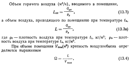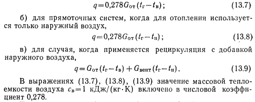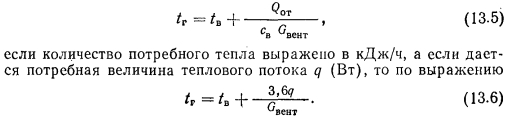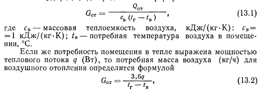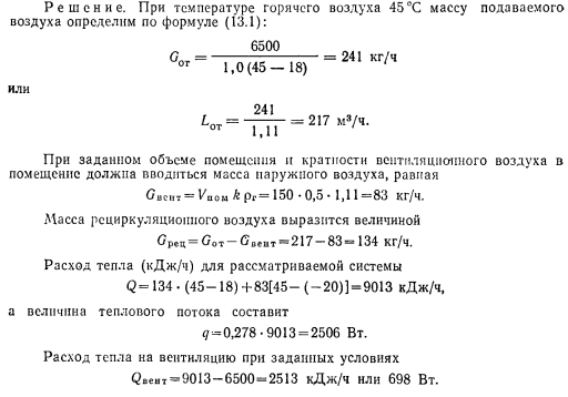 ДОПУСТИМАЯ ТЕМПЕРАТУРА ВВОДИМОГО В ПОМЕЩЕНИЯ НАГРЕТОГО ВОЗДУХА, ОПРЕДЕЛЕНИЕ ЕГО МАССЫ И ТЕПЛОВОЙ МОЩНОСТИ УСТАНОВОК ВОЗДУШНОГО ОТОПЛЕНИЯПредельная температура воздуха, поступающего в помещения из систем воздушного отопления, зависит от того, насколько удалены места ввода воздуха от мест постоянного пребывания людей. При постоянном или длительном (более двух часов) пребывании людей в помещениях с воздушным отоплением и при выпуске воздуха в верхнюю зону помещения (выше 4 м от пола при горизонтальных и наклонных струях и 6 м при струях, направленных вертикально вниз, воздух можно нагревать до 70 °С с тем, однако, условием, чтобы его температура на расстоянии 2 м от рабочих мест не превышала 40...45°С, а при длительном воздействии струи не должна быть более 25 °С. Эти требования не распространяются на воздушно-тепловые завесы, действие которых на человека кратковременно. Если для воздушного отопления воздух будет подогреваться до температуры tT (°С), то масса воздуха G0T (кг/ч), которую необходимо ввести в помещение при потребном количестве тепла для отопления 5от (кДж/ч), определится по формуле ![]() ![]() Одновременно с определением массы воздуха, потребной для воздушного отопления, находятся вентиляционные обмены и масса воздуха, которую требуется вводить в помещение для вентиляции. Если масса воздуха, потребная для отопления, больше или равна массе воздуха, потребной для вентиляции (GoTGsem), то в качестве расчетных величин принимаются температура и масса отопительного воздуха. Система отопления принимается прямоточной или, если это допустимо, с частичной рециркуляцией. Если же масса вентиляционного воздуха больше массы воздуха, потребного для отопления (ОвентС0т), то в качестве расчетной принимается масса вентиляционного воздуха, система принимается прямоточной, а температура воздуха, вводимого в помещение, tv (°С), определяется выражением ![]() В жилых помещениях масса воздуха, подаваемого системой воздушного отопления, определяется исходя из возмещения воздуха, удаляемого вытяжной вентиляцией в следующих количествах: при средней наружной температуре отопительного периода вытяжными вентиляционными системами должно удаляться из кухонь не менее 3 м3/ч на 1 м2 жилой площади квартиры, а в целом не менее 60 м3/ч, из раздельных санузлов по 25 м3/ч, а из объединенных.— 50 м3/ч; при температуре наиболее холодной пятидневки из кухонь должно удаляться 3,75 м3/ч на 1 м2 жилой площади, но не менее 75 м3/ч; из объединенных санузлов 65 м3/ч и из раздельных по 30 м3/ч. При выпуске приточного воздуха в жилые помещения на высоте до 3,5 м от уровня пола температура его не должна быть более 45 °С. Потребную тепловую мощность (Вт) систем воздушного отопления определяют по следующим выражениям: а) для случая работы системы на полную рециркуляцию ![]() При исключении из формул коэффициента 0,278 расчет по этим формулам покажет часовой расход тепла в кДж/ч. Пример. Определить массу воздуха, которую необходимо вводить в помещение при теплопотерях последнего 6500 кДж/ч, соответствующих температуре наиболее холодной пятидневки — 20 °С. Температура помещения 18 °С. Определить также общий расход тепла системой воздушного отопления, если для целей вентиляции необходима кратность воздухообмена 0,5 при объеме помещения 150 м3. ![]() |