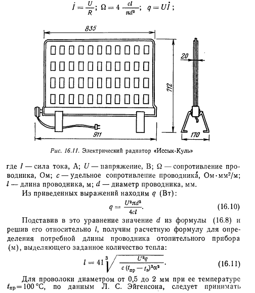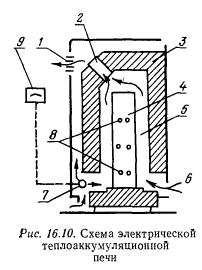 ЭЛЕКТРИЧЕСКОЕ ОТОПЛЕНИЕИспользование электрической энергии для обогрева помещений дает много преимуществ по сравнению с системами центрального отопления и делает этот вид отопления весьма перспективным для внедрения, особенно с применением тепловых насосов и при использовании электрической энергии для отопления в часы ночных провалов потребления электрической энергии ее постоянными потребителями. К достоинствам электрического отопления относят малое потребление металла сравнительно с системами водяного и парового отопления, удобство и простоту подводки, компактность отопительных приборов и высокий коэффициент их полезного действия (до 100%), отсутствие продуктов сгорания и загрязнения ими атмосферного воздуха, гибкость регулирования и простоту автоматизации, возможность достижения хороших гигиенических и эстетических условий в отапливаемых помещениях. Недостатками электрического отопления являются: пожарная опасность при применении приборов накаливания открытого типа, высокая отпускная стоимость электроэнергии и недостаточность ее выработки. Последний из недостатков несколько сглаживается быстрыми темпами роста выработки электроэнергии. ![]() Наличие так называемых «провалов» в потреблении электроэнергии ее традиционными потребителями в ночное время создает значительные возможности потребления ее для отопления, что и практикуется в ряде европейских стран. В этих странах в целях сохранения постояного ритма работы Рис. 16.10. Схема электрической электрических станций в ночной период теплоаккумуляционной электроэнергия отпускается по сниженному тарифу и используется для получения и аккумулирования тепла с последующей раздачей его потребителям в дневной период. В качестве аккумулятора применяют электрические теплоаккумуляционные печи, одна из которых схематически показана на рис. 16.10. Теплоаккумулирующий сердечник 4 печи с изоляцией 3 заключен либо в металлический корпус, либо в корпус из термостойкого синтетического материала. В корпусе имеются отверстия для входа 6 и выхода 1 воздуха с дроссельной заслонкой 2, регулирующей проход воздуха по каналам 5. Нагревательные элементы 8, изготовленные из хромоникелевых или железохромалюминиевых сплавов, закладываются в сердечник 4. Нагрев сердечника регулируется термостатом 9 и автоматическим регулятором 7. Сердечники изготавливают из кремнистого чугуна или керамических магнезитовых материалов, способных выдерживать высокую температуру и обладающих достаточно высокой теплоемкостью. В качестве изоляции 3 применяют силикат кальция в виде плит, минеральный войлок или минеральную вату, бетонит. Мощность применяемых электрических теплоаккумуляционных печей находится в пределах от 2 до 8 кВт. Не исключается возможность использования электроэнергии в комбинированных системах, когда основные теплопотери зданий возмещаются нерегулируемой системой водяного отопления, обеспечивающей в расчетный период температуру воздуха в помещениях в пределах 10...15°С, а повышение температуры до требуемой осуществляется самими абонентами включением дополнительных электрических нагревателей. Варианты электрического отопления весьма разнообразны, а применение их зависит от конкретных условий и в каждом случае должно быть подтверждено технико-экономическими ра