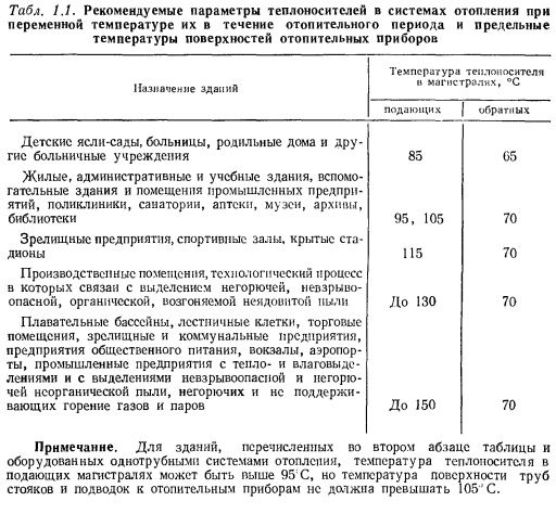 ЭЛЕМЕНТЫ ОТОПИТЕЛЬНЫХ УСТАНОВОК, ТЕПЛОНОСИТЕЛИ И КЛАССИФИКАЦИЯ СИСТЕМ ОТОПЛЕНИЯКаждая отопительная установка, предназначенная для поддержания в помещениях заданной температуры воздуха, состоит из трех основных элементов: теплового центра, в котором теплоносителю передается необходимое количество тепла, системы теплопроводов для перемещения по ним теплоносителя и отопительных приборов, передающих тепло от теплоносителя воздуху и ограждениям помещения. В отопительных установках в качестве теплоносителя применяют воду, насыщенный водяной пар и воздух. Вода, имеющая большую теплоемкость и плотность, позволяет передавать значительное количество тепла в малых объемах и, что весьма важно, изменять теплосодержание этих объемов путем соответствующего понижения или повышения температуры. В целях уменьшения затрат энергии перемещение воды производят при скоростях, не превышающих 3 м/с. Ценность водяного пара как теплоносителя заключается в большой величине тепла, выделяющегося при его конденсации в отопительных приборах. Транспортирование пара к зданиям осуществляется со скоростями порядка 40...80 м/с, что позволяет передавать большое количество тепла на значительные расстояния при сравнительно малых затратах энергии. Высокая температура пара при давлении выше 0,1 МПа допускает его применение только в отопительных установках промышленных и коммунальных предприятий, в которых температура на поверхности отопительных приборов должна быть не выше 130 °С. Использование пара с температурой ниже 100°С требует поддержания в отопительных установках вакуума, что удорожает их устройство и усложняет эксплуатацию. Воздух как теплоноситель хотя и не требует установки отопительных приборов в помещениях, но для их обогрева применяется редко. Воздух имеет малую удельную теплоемкость — 1 кДж/(кг-К), и для передачи даже небольших количеств тепла требуется перемещение значительных объемов воздуха; затраты энергии при этом оказываются большими, чем при транспортировании такого же количества тепла с помощью воды или пара. Трубопроводы или каналы для перемещения воздуха требуют больших сечений и занимают сравнительно с трубопроводами для воды или пара большие объемы. Табл. 1.1. Рекомендуемые параметры теплоносителей в системах отопления при переменной температуре их в течение отопительного периода и предельные температуры поверхностей отопительных приборов ![]() Обогрев помещений нагретым воздухом выгоден тогда, когда допустимо полное или частичное возвращение его для повторного подогрева без устройства распределительных трубопроводов, что зачастую и выполняется в производственных зданиях большого объема. Выгодно и неизбежно применение воздуха как теплоносителя при совмещении обогрева и вентилирования помещений и необходимости восполнения того количества воздуха, которое удаляется из помещений технологическими установками. При наличии в данной местности геотермальных вод, удовлетворяющих требованиям к качеству их для применения в системах теплоснабжения, и при соответствующих технико-экономических сопоставлениях с решениями на базе использования традиционных источников тепла, они также могут быть применены в качестве теплоносителя для систем отопления. Из рассмотренных теплоносителей наиболее распространенным 