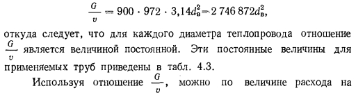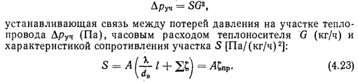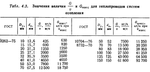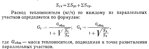 ГИДРАВЛИЧЕСКИЙ РАСЧЕТ ТЕПЛОПРОВОДОВ ПО ХАРАКТЕРИСТИКАМ СОПРОТИВЛЕНИЯОсновной формулой для проведения гидравлического расчета теплопроводов по характеристикам сопротивления является формула (4.16) ![]() Выражение, заключенное в скобки в формуле (4.23), есть не что иное, как приведенный коэффициент местного сопротивления участка ?ПР, определение которого требуется при проведении расчетов теплопроводов способом динамических давлений [см. формулу (4.10)]. Предварительное определение диаметров теплопроводов на отдельных участках систем отопления можно производить с учетом допустимой скорости движения теплоносителя или по характеристике сопротивления участка. Рассмотрим первый случай. Если в выражении (4.14) для температуры 80° С, являющейся средней температурой при расчетных условиях, принять величину р = 972 кг/м3, то его можно привести к виду ![]() Используя отношение, можно по величине расхода на участке заданного диаметра находить скорость теплоносителя, а при гидравлическом расчете теплопроводов по расходу н принимаемой скорости определять предварительно диаметр теплопровода. В табл. 4.3 даны и максимально допустимые расходы теплоносителя по трубам, вычисленные исходя из предельных скоростей, устанавливаемых СНиП 11-33—75, с помощью которых также можно предварительно определять диаметр теплопроводов. Во втором случае при известной разности давлений для расчета системы Аррасч находят Rcр но формуле (4.9) и определяют характеристику сопротивления участка, пользуясь выражением ![]() ![]() По найденному значению 5уд, используя приложения VII и VIII, в которых даны характеристики сопротивления 1 м трубопровода для каждого диаметра, выбирают соответствующий диаметр теплопровода участка. Принятые диаметры труб дают возможность подсчитать приведенный коэффициент местного сопротивления для каждого участка, умножение которого на соответствующую величину удельного динамического давления позволяет получить характеристики сопротивления участков. По известным характеристикам сопротивления участков и расходам теплоносителя определяются потери давления на участках. Если система отопления монтируется из унифицированных узлов, как это имеет место при монтаже однотрубных систем с П-образными стояками, то характеристики сопротивления отдельных узлов могут быть определены заранее и гидравлический расчет системы с применением описанного способа упрощается и оказывается весьма удобным. При отсутствии данных о характеристиках сопротивления отдельных узлов их можно найти, пользуясь приложениями VII и VIII, в которых приведены характеристики сопротивления отдельных местных сопротивлений и труб. При этом следует помнить, что характеристики сопротивления последовательно расположенных на участке местных сопротивлений или местных сопротивлений, заменяющих потери по длине, суммируются. При расчете последовательно соединяемых участков системы отопления общая характеристика сопротивления их всегда будет равна сумме характеристик сопротивлений отдельных участков Si n = S1 + S2 +... + Sn-i + Sn, ![]() Для нахождения характеристики сопротивления стояка в целом суммируются характеристики сопротивления узлов и характеристики сопротивления прямых участков труб, соединенных последовательно с узлами: ![]() Гидравлический расчет теплопроводов систем отопле