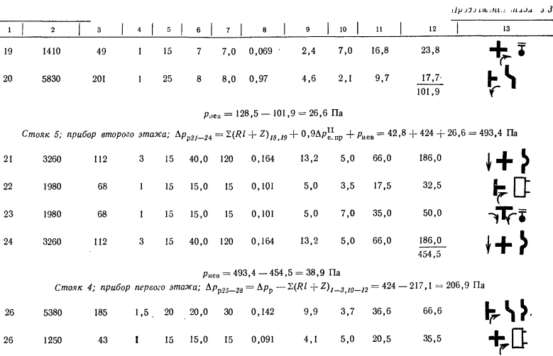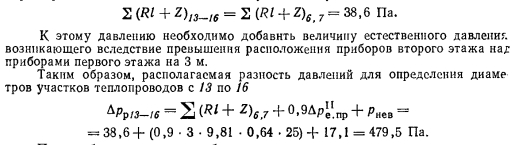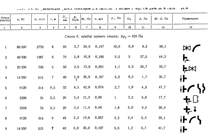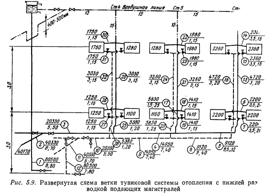 ГИДРАВЛИЧЕСКИЙ РАСЧЕТ ТЕПЛОПРОВОДОВ СИСТЕМЫ ВОДЯНОГО ОТОПЛЕНИЯ с ЕСТЕСТВЕННОЙ ЦИРКУЛЯЦИЕЙ, НИЖНЕЙ РАЗВОДКОЙ И ТУПИКОВЫМ ДВИЖЕНИЕМ ТЕПЛОНОСИТЕЛЯ В МАГИСТРАЛЯХСистема отопления с нижней, разводкой применяется в тех случаях, когда здания имеют бесчердачные покрытия или подвал, проходящий под всем зданием и дающий возможность прокладывать магистральные теплопроводы без дополнительных затрат на сооружение подпольных каналов. Системы отопления с нижней разводкой обладают следующими положительными качествами: монтаж и пуск системы может производиться по-этажно по мере возведения здания; уменьшаются потери тепла подающими магистралями; по сравнению с системами с верхней разводкой эти системы имеют большую гидравлическую устойчивость. Недостатками таких систем следует считать: необходимость устройства специальной воздушной линии для удаления воздуха из системы в период ее пуска и эксплуатации (воздушную линию прокладывают под потолком верхнего этажа здания); устанавливаемые вместо воздушной линии воздуховыпускные краны на каждом из приборов верхнего этажа требуют периодической проверки путем обхода всех помещений; для присоединения расширительного бака нужна прокладка отдельного стояка. Гидравлический расчет теплопроводов системы производят обычно способом удельных потерь на трение. Этот расчет иллюстрируется примером, для которого взята ветка рассмотренной в § 5.3 системы с теми же параметрами воды и тепловыми нагрузками, но с изменениями в схеме разводки теплопроводов (рис. 5.9). ![]() ![]() ![]() ![]() ![]() ![]() Расчет теплопроводов стояков 4 и 5 проводится в такой же последовательности: вначале считаются участки, подводящие воду к приборам первого этажа, а затем к приборам второго этажа с учетом соответствующих невязок и величины естественного давления для второго этажа. Все данные по определению расчетной разности давлений и подбору соответствующих участков приведены в табл. 5.3. На рис. 5.9 показана воздушная линия, которую следует прокладывать строго горизонтально и соединять с трубой, идущей к расширительному баку. Место присоединения воздушной трубы к расширительной трубе бака должно быть ниже расположения воздушной трубы на 400...500 мм. Образующаяся петля необходима для обеспечения заполнения воздушной трубы воздухом и предотвращения тем самым нежелательной циркуляции воды между стояками по воздушной линии. Из приведенных расчетов теплопроводов систем отопления с естественной циркуляцией, верхней или нижней разводкой и тупиковым движением воды в магистральных теплопроводах видно, что при расчете циркуляционных колец приборов, установленных на ближних стояках, получаются такие расчетные разности давлений, которые затруднительно погасить имеющимся сортаментом труб и приходится избытки давления гасить кранами двойной регулировки. В рассмотренных примерах § 5.3 и 5.4 отдельные ветки системы короткие и имеют малое количество стояков при сравнительно небольшой нагрузке. При длинных ветках и большем количестве стояков этот недостаток систем с тупиковым движением воды проявляется более резко. Поэтому, проектируя эти системы с естественной, а тем более с искусственной циркуляцией, следует избегать длинных веток с большим количеством стояков и распределять потери давления в ветках таким образом, чтобы гасит