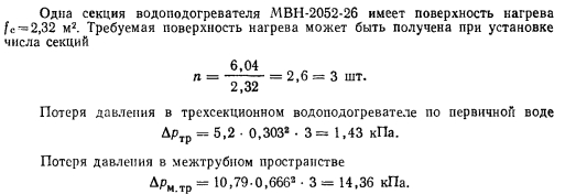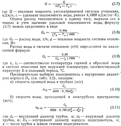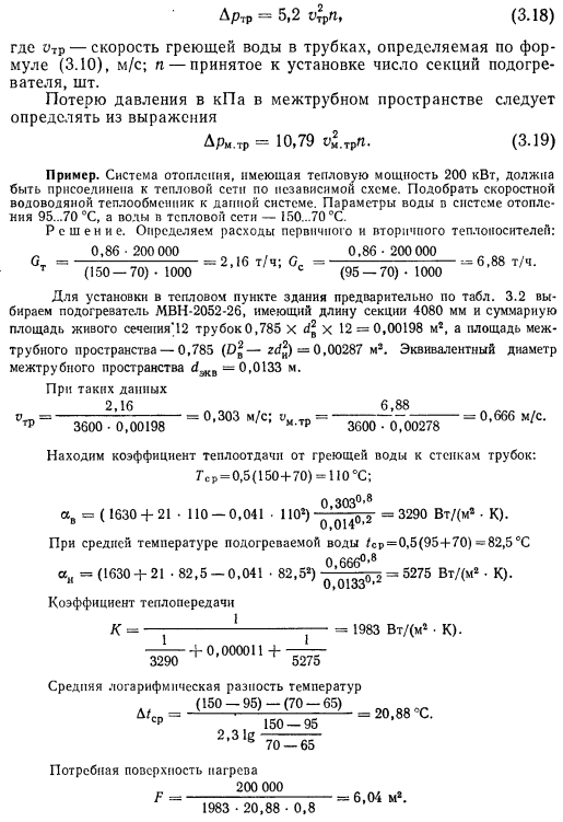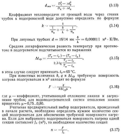МЕТОД ПОДБОРА СКОРОСТНЫХ ВОДОВОДЯНЫХ ПОДОГРЕВАТЕЛЕЙТребуемая поверхность нагрева скоростных водоводяных подогревателей определяется из условия, что греющая высокотемпературная вода пропускается по трубкам, а подогреваемая вода системы отопления — по межтрубному пространству. Для удобства дальнейших расчетов учтем, что плотность воды в системе отопления близка к 1000 кг/м3 или 1 т/м3, а это значит, что выражение расхода воды в т/ч равнозначно выражению расхода в м3/ч. Потребную массу греющей воды (кг/с) можно определить по формуле ![]() Для выравнивания скоростей теплоносителей как в трубках, так и в межтрубном пространстве, что приводит к увеличению коэффициента теплопередачи, меньшее количество воды следует пропускать по меньшему сечению, т. е. греющую воду следует пропускать по трубкам. Коэффициент теплоотдачи (Вт/(м2-К) от греющей воды к стенкам трубок и от наружной поверхности трубок к нагреваемой воде следует определять по формуле ![]() При определении коэффициента теплопередачи от греющей воды к стенкам трубок вместо t, v и d необходимо подставить среднюю температуру греющей воды Гср=0,5 (Tv+T0) (°С), скорость движения этой воды атр (м/с) и значение внутреннего диаметра трубок dB (м), а при определении коэффициента теплоотдачи. от трубок к подогреваемой воде, движущейся в межтрубном пространстве, соответственно d3KB — эквивалентный диаметр межтрубного пространства, который определяют из выражения ![]() При несоответствии ранее принятого подогревателя получающимся результатам следует принять иной подогреватель и прокорректировать расчеты по новым данным. Потери давления в подогревателях складываются из потерь давления на трение и потерь давления в местных сопротивлениях. Потери давления (кПа) внутри трубок подогревателей, имеющих длину секции 4 м, ![]() ![]() |