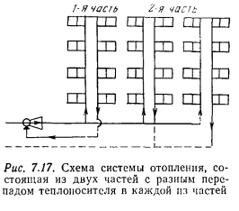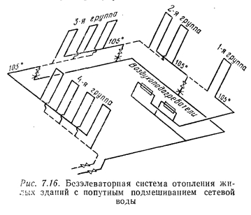 НЕКОТОРЫЕ ПРЕДЛОЖЕНИЯ ПО УСТРОЙСТВУ КОМБИНИРОВАННЫХ СИСТЕМ ОТОПЛЕНИЯ С ДЕЦЕНТРАЛИЗОВАННЫМ СМЕШЕНИЕМВо всех рассмотренных системах отопления применялся теплоноситель определенных параметров, который при использовании высокотемпературной воды приготавливался в тепловых пунктах с использованием специальных теплообменников или в смесительных установках с водоструйными элеваторами. Стремление к удешевлению систем отопления путем непосредственного использования высокотемпературного теплоносителя с одновременным сохранением температуры поверхности отопительных приборов на требуемом санитарном уровне приводит к появлению предложений но децентрализованному получению требуемых параметров теплоносителя. Одним из них является комбинированная однотрубная система отопления с нижней разводкой и П-образными стояками, предложенная Л. И. Рохлецовым, которая предполагает использование высокотемпературной воды без применения элеватора. Sta система удобна для применения и в тех случаях, когда давление в тепловой сети на вводе не обеспечивает нормальной работы элеватора. Как видно из рис. 7.16, стояки системы (условно показанные без отопительных приборов) разделены на несколько последовательно соединенных групп, а стояки, входящие в каждую из групп, соединены параллельно. ![]() Сетевая вода, имеющая температуру 150 °С, после ввода в здание делится на два потока. Один поток проходит через рециркуляционные воздухоподогреватели лестничных клеток, охлаждается в них до 105 °С и поступает в первую группу стояков, в которой охлаждается до заданной температуры и направляется во вторую группу стояков. За счет подмешивания сетевой воды из второго потока обратная вода первой группы стояков доводится до температуры 105°С и поступает во вторую группу стояков, где она снова охлаждается до заданной температуры. При переходе в третью группу стояков к этой воде снова подмешивается порция высокотемпературной воды и т. д. ![]() По данным автора, в описанной системе по сравнению с обычными элеваторными системами достигается экономия на радиаторах до 15 % и трубопроводах до 45 %. Это происходит за счет повышения скоростей теплоносителя в трубах и повышения температуры обратной воды в начальных группах стояков системы. Общая стоимость системы уменьшается на 20 %. Несколько иным является предложение М. Т. Ральчука, также направленное па повышение эффективности и удешевление систем отопления. По этому предложению, система отопления должна быть разделена на две части (рис. 7.17), в которые от общего элеватора подается теплоноситель с определенной заданной температурой (105, 115, 130°С). В первой части системы теплоноситель охлаждается до температуры в пределах 80,85, 90, 95 °С и возвращается в элеватор. В связи с этим в этой части системы средняя температура теплоносителя в отопительных приборах повышается, теплоотдача приборов увеличивается, а число их сокращается. Во второй части системы теплоноситель охлаждается до более низкой температуры (55, 60, 65, 70 °С), с которой он и возвращается в тепловые сети города. Целесообразность принятия тех или иных значений температур обратной воды в каждой части системы обосновывается целесообразностью уменьшения расхода отопительных приборов и труб. Экономичность системы отопления в целом зависит от распределения тепловых 