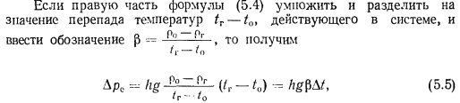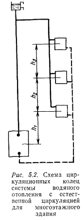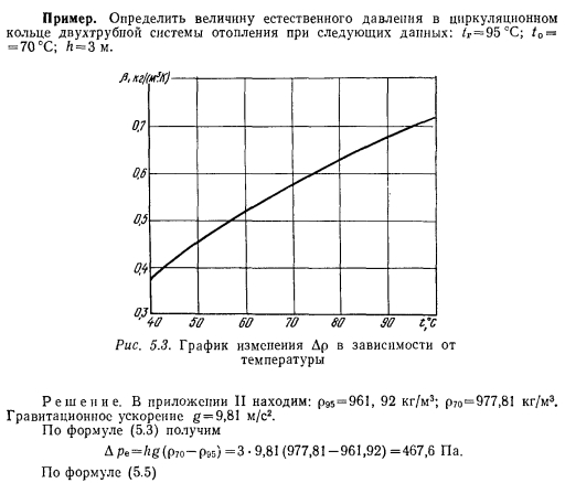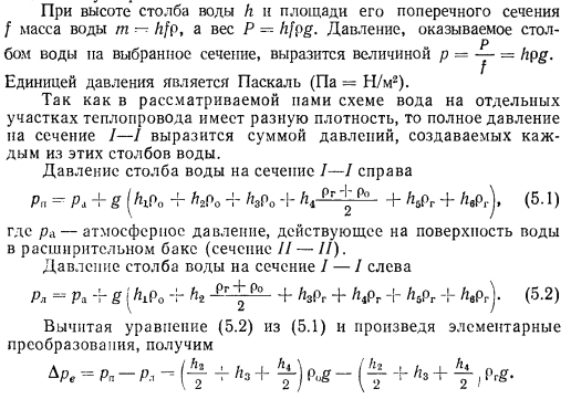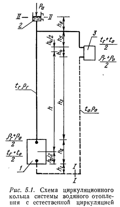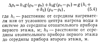 ОПРЕДЕЛЕНИЕ ЕСТЕСТВЕННОГО ДАВЛЕНИЯ, ДЕЙСТВУЮЩЕГО В ДВУХТРУБНЫХ СИСТЕМАХ ВОДЯНОГО ОТОПЛЕНИЯСистемы водяного отопления с естественной циркуляцией теплоносителя весьма удобны для отдельных небольших зданий, получающих тепло от собственной котельной. Радиус действия таких систем не превосходит 30 м. Эти системы надежны, бесшумны, просты в эксплуатации и не требуют затрат механической (или электрической) энергии для повседневной работы. К недостаткам систем следует отнести несколько повышенный расход металла и замедленный прогрев системы в период пуска. Системы отопления с естественной циркуляцией теплоносителя допускаются (при соответствующем обосновании) для обогрева помещений в верхних зонах высотных зданий. ![]() При естественной циркуляции наиболее целесообразно применение верхней разводки горячих магистральных теплопроводов, которые при прокладке по чердаку должны изолироваться для предотвращения бесполезных потерь тепла. Нижняя разводка горячих теплопроводов применяется редко и в основном в тех случаях, когда отапливаемое здание имеет бесчердачное покрытие. Причиной возникновения естественного давления в системах водяного отопления является свойство воды, как и всякого физического тела, изменять объем при изменении температуры. Величина коэффициента объемного расширения воды не постоянна и зависит от температуры. При температуре 80 °С р-0,0006 Кг. Поэтому плотность (кг/м3) (объемная масса) единицы объема горячей воды всегда будет меньше плотности холодной воды (см. приложение II), а результатом этого является возникнове ние разности давлений, благодаря которой происходит движение воды в теплопроводах системы отопления. Выясним, какие факторы, кроме температурных, влияют на величину естественного давления. Рассмотрим простейшую схему системы отопления, состоящую из нагревателя, отопительного прибора 3 и теплопроводов (рис. 5.1). Как и в любой системе отопления, обязательным элементом является расширительный бак 2, устанавливаемый в наивысшей точке системы и необходимый для вмещения прироста объема нагреваемой воды и удаления воздуха. При рассмотрении представленной схемы, состоящей из одного циркуляционного кольца, делаем допущение, что остывание воды от температуры tr до t0 происходит только в отопительном приборе. Как в подающем, так и в обратном теплопроводах вода не остывает. Температуру воды в нагревателе и в приборе принимаем равной средней температуре горячей и охлажденной воды: ![]() Для циркуляции воды в рассматриваемом замкнутом контуре необходимо наличие разности давлений по обе стороны какого- либо сечения. Выберем для этого сечение и определим, имеется ли разность давлений по обе стороны его. Вспомним, что гидростатическим давлением называют отношение силы к той площади, на которую она действует. Следовательно, на любое сечение, выбранное в теплопроводе, действует вес вертикального столба воды, равный массе воды, умноженной на гравитационное ускорение. ![]() ![]() Из формулы (5.3) следует, что величина естественного давления равна расстоянию по вертикали от середины нагревателя до середины отопительного прибора, умноженному на гравитационное ускорение и на разность плотностей охлажденной и горячей воды. Атмосферное давление, высота расположения расширительного бака и удаление отопительного п