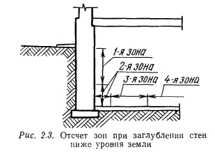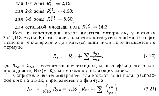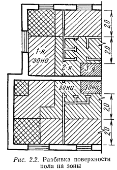 ОПРЕДЕЛЕНИЕ ПОТЕРЬ ТЕПЛА ЧЕРЕЗ ПОЛЫ, РАСПОЛОЖЕННЫЕ НА ГРУНТЕ, И СТЕНЫ, ЗАГЛУБЛЕННЫЕ В ЗЕМЛЮТочное решение задачи но определению количества тепла, передаваемого от воздуха помещений наружному воздуху через конструкцию пола и слой грунта, являющегося основанием пола, весьма сложно, а доля потерь тепла через пол по сравнению с общими теплопотерями любого помещения невелика. Поэтому на практике применяют упрощенный метод расчета. ![]() Поверхность пола, начиная от внутренних граней наружных стен, делят на зоны, параллельные наружным стенам, шириной 2 м каждая (рис. 2.2). Ближайшая к наружной стене зона считается первой, последующие — второй и третьей, а остальная часть пола, вне зависимости от ее площади, считается четвертой зоной. Деление пола на зоны производится независимо от внутренней планировки помещений первого этажа. Количество зон, умещающихся на площади пола, зависит от размеров здания. В здании, изображенном на рис. 2.2, четвертая зона отсутствует. Определение потерь тепла каждой зоны производят по формуле (2.6), в которой вместо величины действительного сопротивления теплопередаче принимают условную величину его, соответствующую условиям передачи тепла при полной расчетной разности температур. Площадь каждой зоны подсчитывают по фактическим размерам, а площадь первой зоны, примыкающей в пределах ее ширины к наружным углам и имеющей повышенные теплопотери, удваивается (участки с двойной штриховкой на рис. 2.2). Для отдельных зон холодных (неутепленных) полов, т. е. полов, конструкции которых состоят из материалов, имеющих >1,163 Вт/(м-К), установлены следующие величины сопротивлений теплопередаче (К-м2/Вт): ![]() ![]() Такой метод применяется и для подсчета теплопотерь наружными стенами, заглубленными в землю. Разбивку зон в этом случае начинают от уровня земли по внутренней поверхности подземной части стен и далее по полу (рис. 2.3). Величины сопротивления теплопередаче подсчитываются по изложенному методу с учетом утепляющих слоев при наличии их в конструкции степ, заглубленных в землю. |
