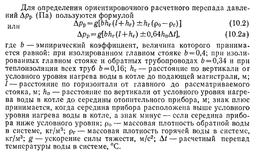 ОСОБЕННОСТИ ОБОРУДОВАНИЯ И РАСЧЕТА КВАРТИРНЫХ СИСТЕМКвартирными принято называть системы отопления, обслуживающие одну квартиру и имеющие отдельный генератор тепла. В качестве теплоносителя в таких системах применяется вода или воздух. В нашей стране получили распространение водяные системы с естественной циркуляцией. Основной особенностью квартирных систем является то, что генератор тепла располагается на одном уровне с отопительными приборами, а иногда и выше. Разность естественных давлений, обеспечивающая циркуляцию воды, возникает в этих системах в основном за счет охлаждения воды в трубах. Она является величиной очень малой, и поэтому расчет квартирных систем отопления требует особой тщательности. В настоящее время в качестве генератора тепла в системах квартирного отопления применяют малометражные чугунные котлы тина ВНИИСТО Мч, автоматические газовые водонагреватели типа АГВ, а также змеевики из гладких труб, заделываемые в кухонные плиты. Находят применение и другие виды водонагревателей, свариваемые из листовой стали. Отопительными приборами могут являться радиаторы, конвекторы и гладкие трубы. В целях уменьшения радиуса действия системы нагревательные приборы могут устанавливаться у внутренних степ. Как правило, такие системы делают двухтрубными с прокладкой горячих магистралей под потолком отапливаемых помещений, а обратных — над полом, если этому не мешают дверные проемы. Осуществляется прокладка обратных магистралей и под полом. Возможно применение проточных и однотрубных систем. Встречаются схемы теплопроводов с прокладкой обратных магистралей под потолком помещений, но такие системы требуют особо тщательных расчетов и в них не исключена возможность уменьшения и даже полного прекращения движения воды в некоторых циркуляционных кольцах. Прокладка обратных магистралей под потолком влечет за собой увеличение расхода труб. Расширительный бак в системах квартирного отопления удобно делать проточным и устанавливать на главном стояке под потолком того помещения, где находится котел. Для контроля за уровнем воды в баке последний снабжают водомерной трубкой. Переливная труба служит и для удаления воздуха из системы. Полезную емкость расширительного бака в литрах определяют по выражению ![]() К недостаткам систем квартирного отопления следует отнести необходимость непрерывной топки котла, применение для магистралей труб относительно больших диаметров и малую теплоемкость систем 1,1, что приводит к быстрому снижению температуры воздуха в помещениях при прекращении работы котла в ночное время. ![]() Расположение условного уровня нагрева воды в котле принимается на 150 мм выше уровня колосниковой решетки. Параметры теплоносителя в квартирных системах отопления принимают следующими: ?Г=90°С, t0 = 70 °С. Первый член правой части формулы (10.2) дает ориентировочную величину разности давлений, вызванной остыванием воды в трубах, а второй — остыванием воды в отопительных приборах. После определения для каждого циркуляционного кольца значения Дрр по формуле (4.9) находят удельное падение давления R для этих же колец, по которому и определяют наиболее невыгодное циркуляционное кольцо и с него начинают расчет теплопроводов. В системах квартирного отопления часто наиболее невыгодным циркуляционным кол