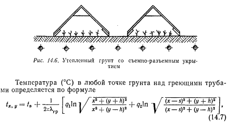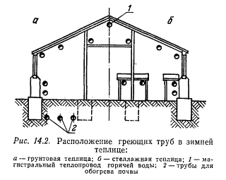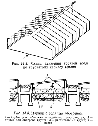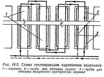 ОТОПЛЕНИЕ ТЕПЛИЦ И ПАРНИКОВЗначение свежих овощей в рационе питания человека общеизвестно. Для круглогодового снабжения населения свежими овощами создаются специализированные хозяйства, на территории которых возводятся сооружения, защищающие почву (особенно в осенний, весенний и зимний периоды) от воздействия внешних факторов, и в этих сооружениях поддерживаются условия, необходимые для успешного и круглогодичного выращивания овощных культур. Такими сооружениями являются стеллажные и грунтовые теплицы и парники. Стеллажные теплицы используют для выращивания рассады и овощей на специальных стеллажах, устанавливаемых на высоте 0,8...0,9 м от земляного пола теплицы. Грунтовые теплицы могут быть зимними, эксплуатируемыми в течение всего года, и весенними, эксплуатируемыми только весной, летом и осенью. Светопрозрачные ограждения теплиц, эксплуатируемых круглый год, выполняют из стекла или пленки, а используемые только весной, летом и осенью—из пленки. Парники относятся к сооружениям весеннего типа и служат в основном для выращивания рассады и ранних овощей. Необходимые температурные условия в теплицах и парниках поддерживаются с помощью систем отопления, для которых в качестве теплоносителя используют горячую воду. При технической возможности и экономической целесообразности допустимо использование газа, электроэнергии и геотермальных вод. Для обогрева парников иногда используют и биологическое топливо (навоз, домовой мусор и др.), которое благодаря биохимическим процессам, происходящим в нем, выделяет значительное количество тепла. Помимо поддержания необходимого температурно-влажностного режима, в зимних теплицах требуется подогрев почвы, который обеспечивается прокладкой труб системы отопления в самом грунте на некоторой глубине. Глубина заложения труб рассчитывается так, чтобы температура грунта в зоне корневой системы растений не нарушала агротехнических условий их жизни. Обычно температуру в корнеобитаемом слое почвы необходимо поддерживать на 2—3° выше температуры воздуха внутри теплицы, а на глубине 25...30 см не более 25...27°С. Расчет систем отопления теплиц производят из условия поддержания требуемых внутренних температур при расчетной температуре наружного воздуха (параметр Б) для холодного периода года данной местности. Внутренние температуры воздуха в теплицах рекомендуется принимать следующими: для грунтовых теплиц + 18°С; для стеллажных выгоночных +.20 °С; для стеллажных разводочных +25°С и для парников +15...18°С. В зависимости от вида культуры и фазы роста выращиваемых культур приведенные значения температур могут отклоняться в ту или иную сторону. Относительная влажность воздуха в теплицах должна поддерживаться в пределах 65...90 %, а объемное содержание СОг не должно превышать 0,35 % Легкие ограждающие конструкции теплиц требуют значительных расходов тепла. Мощность, потребную для обогрева шатра теплицы и системы обогрева почвы, определяют для ночного режима эксплуатации решением системы уравнений теплового баланса, в которую входят уравнения сохранения тепла и массы (массообмен, связанный с теплообменом) для всех объемов и поверхностей сооружения, участвующих в тепло- и массообмене. Суммы потоков в уравнениях баланса являются алгебраическими. При конструировании систем отопления теплиц н