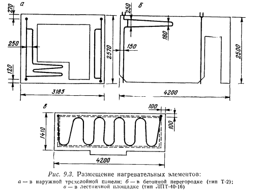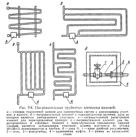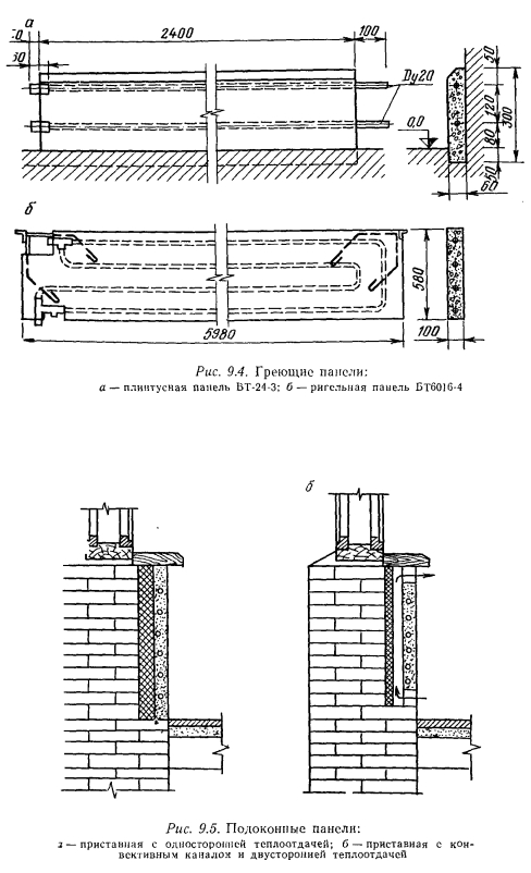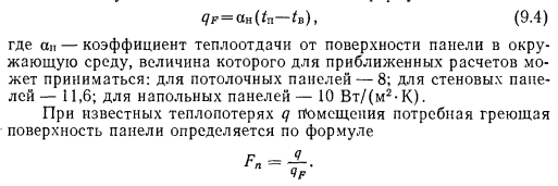 ПЛОЩАДЬ И ТЕМПЕРАТУРА ГРЕЮЩИХ ПАНЕЛЕЙ. ТЕПЛОНОСИТЕЛИРазмеры греющей поверхности панели, средняя температура этой поверхности tn и размещение панели взаимосвязаны. Действующие нормативы, основанные на требованиях гигиенистов и физиологов, рекомендуют следующие температуры поверхности панелей: при расположении их в зоне до 1 м над уровнем пола в жилых и общественных зданиях — 95 °С, в детских садах и больницах — 85 °С; в стенах и перегородках выше 1 м от уровня пола — 45 °С; в потолке помещений, имеющих высоту 2,5...2,8 м,— 28 °С; 2.9...3 м — 30 °С; 3,1...3,4 м — 33 °С; в полу жилых зданий и детских учреждениях — 24 °С; плавательных бассейнах — 31 °С. В коммунальных и зрелищных предприятиях, гимнастических залах, ресторанах, столовых, вокзалах и производственных помещениях для панелей, устанавливаемых на высоте до 1 м над уровнем пола, разрешается иметь среднюю температуру их поверхности при расчетных условиях до 150 °С. Ориентируясь на приведенные значения максимально допустимой температуры поверхности панелей, можно приближенно «определить величину теплоотдачи 1 м2 панели по формуле ![]() Окончательные размеры греющей поверхности панели и ее действительная теплоотдача определяются после теплового расчета и выявления конструктивных элементов панели. В помещениях с большой площадью остекления в целях уменьшения радиационного охлаждения людей и нейтрализации холодных токов воздуха от окоп рекомендуется размещать панели под Окнами или в полу у наружных стен. Хороший эффект в этом случае может дать расположение панелей в простенках между остекленными поверхностями. Теплоносителем для бетонных панелей могут быть вода, пар, воздух. Наиболее распространенным теплоносителем является вода, при которой разогрев панелей при первоначальном запуске системы происходит постепенно, чем исключается возможность появления трещин в бетоне. Горячая вода лучше обеспечивает центральное регулирование теплоотдачи панелей. Пар для обогрева панелей применяется редко. Регулирование теплоотдачи панелей при паре возможно только пропусками. Использование воздуха как теплоносителя в системах панельного отопления встречает пока затруднения из-за необходимости устройства большого количества каналов и точного распределения по ним определенных количеств, воздуха. Расчетная температура горячей воды, поступающей в панели, принимается в пределах от 95 до 105 °С. Температура охлажденной воды 70 С. Возможно применение воды более низкой температуры при напольных и потолочных панелях. Напольные панели могут обогреваться обратной водой системы отопления с понижением ее температуры в панелях па 5...10°С. Это можно осуществлять в тех случаях, когда напольные панели устанавливаются, например, в вестибюлях зданий. Не исключается использование геотермальных вод при их наличии. Панельно-лучистое отопление дает возможность совмещать нагревательные приборы со строительными конструкциями. При этом повышается степень индустриальной готовности, снижаются металлоемкость и трудовые затраты на монтаж систем отопления. Такие панели называют совмещенными. Змеевики или регистры совмещенных панелей могут размещаться во внутренних или наружных стенах зданий полносборного строительства, в несущих плитах перекрытий и лестничных площадок. Эти виды панелей представлены на рис. 9.3 и