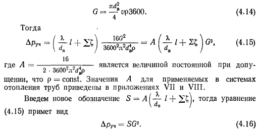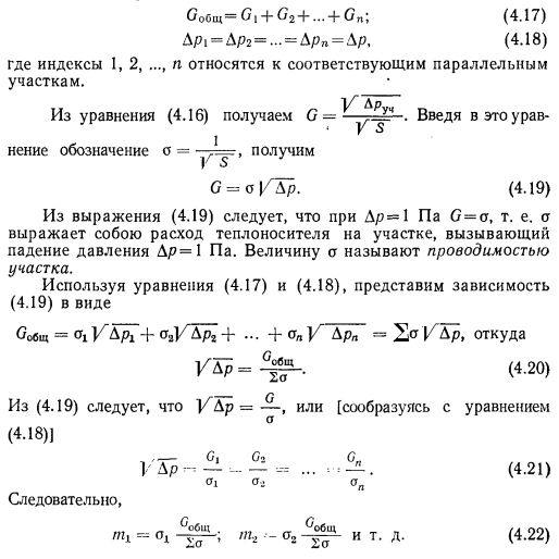 ПОНЯТИЕ О ХАРАКТЕРИСТИКЕ СОПРОТИВЛЕНИЯ И ПРОВОДИМОСТИ УЧАСТКА ТЕПЛОПРОВОДАПотери давления на любом из участков теплопровода, как это следует их формулы (4.8), выражаются зависимостью ![]() Введем в это уравнение величину часового расхода массы теплоносителя G (кг/ч), используя известное из гидравлики уравнение неразрывности, по которому ![]() Если с определенной степенью допущения, не влияющей на точность расчетов, принять % и для каждого участка постоянными, то S = const. В этом случае потеря давления на участке будет прямо пропорциональна квадрату расхода теплоносителя в нем, а величина 5 может быть названа характеристикой сопротивления участка. Уравнение (4.16) дает возможность проследить изменение потерь давления на участке при переменных расходах теплоносителя. С геометрической точки зрения это уравнение представляет собой уравнение параболы с вершиной в начале координат. С определенным допущением это уравнение выражает собою и характеристику любой разветвленной сети теплопроводов, в которой потери давления в местных сопротивлениях пропорциональны квадрату скорости движения жидкости. С помощью уравнения (4.16) можно сравнительно просто решить вопрос о пропускной способности или проводимости участка в определенных условиях. Известно, что при разделении потока жидкости на несколько параллельных потоков, сливающихся в итоге снова в общий поток, обязательно сохранение следующих зависимостей: ![]() Введение понятия о характеристике сопротивления и проводимости участка облегчает решение некоторых задач при расчете и анализе работы систем отопления. В частности, уравнение (4.22) позволяет сравнительно легко определять расходы в параллельных участках теплопроводов, если известны общий расход и проводимости отдельных участков. |