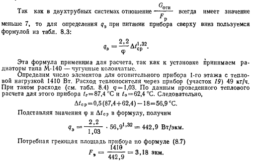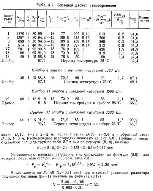 ПРИМЕРЫ ОПРЕДЕЛЕНИЯ ПОТРЕБНОЙ ГРЕЮЩЕЙ ПЛОЩАДИ ОТОПИТЕЛЬНЫХ ПРИБОРОВПример 1. Произвести расчет отопительных приборов стояка 5 двухтрубной системы отопления с верхней разводкой и естественной циркуляцией (см. рис. 5.8). Параметры теплоносителя 95...70°С, температура воздуха в помещении f» = 18°C, температура наружного воздуха наиболее холодной пятидневки н= — 25 °С. Решение. Так как циркуляция теплоносителя в системе отопления естественная, то для правильного определения теплового потока, поступающего от труб н отопительных приборов в помещения, необходимо определить действительную температуру теплоносителя в стояках при открытой их прокладке и температуру его при поступлении в отопительные приборы. Главный стояк и теплопроводы, проходящие по чердаку, покрыты изоляцией, имеющей коэффициент эффективности 85 %. Температуру на чердаке для расчетных условий принимаем t4Л= —15 °С. Расход теплоносителя на участках, диаметр и длину теплопроводов получаем из табл. 5.2. Теплоотдачу не изолированных вертикальных и горизонтальных труб принимаем по приложению XII. Тепловой расчет теплопроводов проводим по методике, изложенной в § 8.5, а данные расчета заносим в табл. 8.9. Так как в двухтрубных системах отношение всегда имеет значение меньше 7, то для определения q3 при питании прибора сверху вниз пользуемся формулой из табл. 8.3: ![]() ![]() К установке принимаем 8 элементов, так как при расчете по этой формуле следует принимать ближайшее большее число элементов. Определение количества элементов радиатора М-140 для других приборов, получающих тепло от стояка 5, сводим в табл. 8.10, в которой помещен и проведенный выше расчет. |