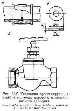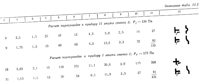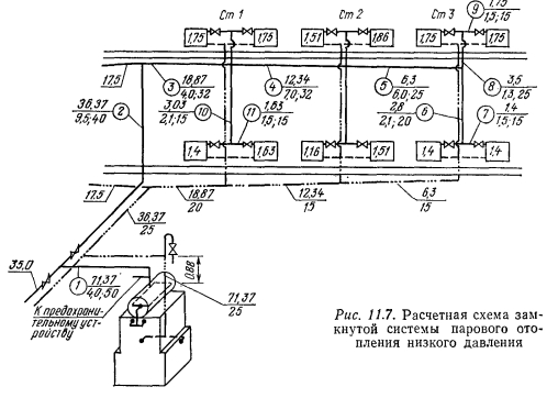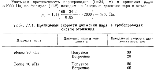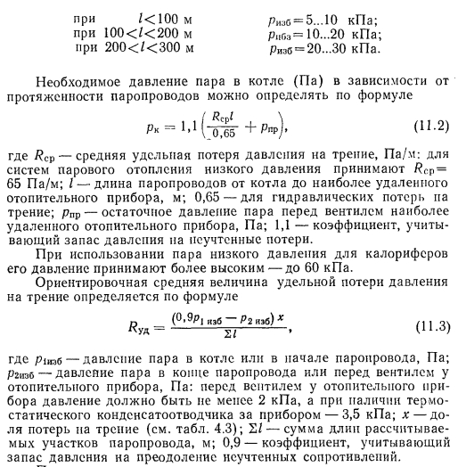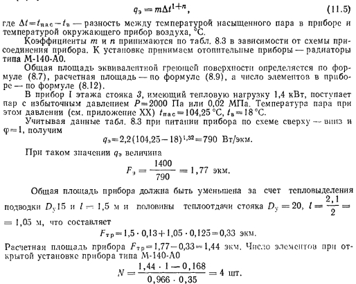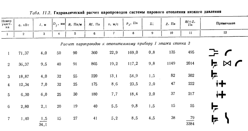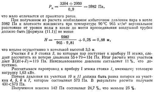 ГИДРАВЛИЧЕСКИЙ РАСЧЕТ ТРУБОПРОВОДОВ СИСТЕМ ПАРОВОГО ОТОПЛЕНИЯ НИЗКОГО ДАВЛЕНИЯГидравлический расчет паропроводов проводится методом удельных потерь на трение [см. формулы (4.8) и (4.9)] или методом приведенных длин [формулы (4.11), (4.12) и (4.13)]. Вспомогательные таблицы для гидравлического расчета паропроводов методом удельных потерь на трение по структуре аналогичны таблице приложения IX. Таблица для расчета паропроводов низкого давления дана в приложении XVII, а величины pg — в приложении XVIII. Значения коэффициентов местных сопротивлений принимаются по приложениям V и VI. Потеря давления в местных сопротивлениях ориентировочно принимается в размере 35 % от общих потерь (см. табл. 4.2). Для преодоления сопротивлений, не учтенных расчетом, оставляется запас величиной 10 % от расчетного давления. Увязку давлений во взаимосвязанных частях системы производят с учетом потерь давления только для тех участков, которые не являются общими для этих частей. Разность потерь давления во взаимосвязанных участках не должна превышать 25 %. Давление пара в котле для систем парового отопления низкого давления зависит от длины I паропровода от котла до наиболее удаленного стояка и принимается следующим: ![]() При невозможности увязки потерь давления во взаимосвязанных частях системы применяются дросселирующие шайбы, варианты установки которых показаны на рис. 11.6. При необходимости устанавливают одну шайбу на стояк для всех отопительных приборов данного стояка или на ответвлениях к приборам, если разница в потере давления между приборами рассматриваемого стояка превышает 300 Па. Диаметр дросселирующей шайбы (мм) определяется по формуле ![]() ![]() Пример. Рассчитать паропроводы одной из веток замкнутой системы парового отопления низкого давления (рис. 11.7). Решение. Расчетное направление выбираем по участкам с большей нагрузкой по пути к наиболее удаленному от котла отопительному прибору и обозначаем их номерами с / по 7. Данные о нагрузках (кВт) на участках и их длины заносим в расчетный бланк, где отмечаем и местные сопротивления, имеющиеся на участках. ![]() ![]() Ориентируясь на величину Руд = 65 Па/м, по нагрузкам участков в приложении XVII определяем диаметр паропроводов, скорости движения пара и действительные величины R. Значения коэффициентов местных сопротивлении принимаем по приложениям V и VI, а величины рд — по приложению XVIII. Данные расчета сводим в табл. 11.2. В результате расчета получена потеря давления на расчетном направлении 3384 Па. С учетом необходимого давления перед прибором и запаса 10 % на неучтенные потери давление пара в котле должно быть ![]() ![]() ![]() ![]() Расчет остальных участков рассматриваемой ветки системы отопления производится аналогичным образом. Диаметры конденсатопроводов, указанные на рис. 11.7, подобраны в соответствии с данными приложения XIX. Такой же метод расчета применяется и для разомкнутых систем парового отопления низкого давления. Подбор требуемой греющей площади отопительных приборов при теплоносителе «насыщенный пар» определяется по плотности теплового потока на 1 экм по формуле ![]() Аналогично определяется количество элементов и для других приборов |