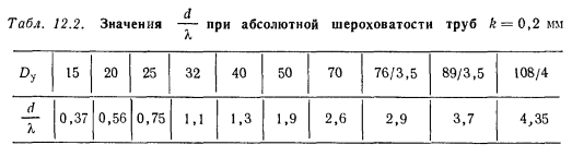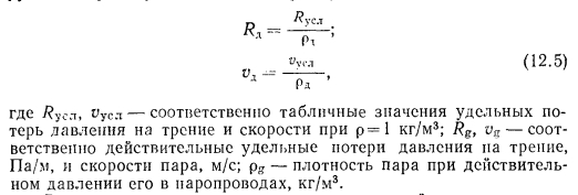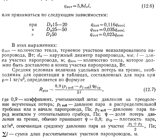 ОСНОВЫ ГИДРАВЛИЧЕСКОГО РАСЧЕТА ПАРОПРОВОДОВ СИСТЕМ ПАРОВОГО ОТОПЛЕНИЯ ВЫСОКОГО ДАВЛЕНИЯОсобенностью гидравлического расчета паропроводов систем отопления высокого давления является необходимость учета изменения объема пара при изменении его давления и уменьшения количества транспортируемого пара вследствие попутной конденсации его из-за сравнительно больших потерь тепла трубопроводами, особенно если они не изолированы. Учитывая эти особенности, расчет паропроводов производят на пропуск по ним пара плотностью р=1 кг/м3, чему соответствует избыточное давление пара 0,08 МПа, температура =116,3°С, теплота фазового перехода г~2220,6 кДж/кг и кинематическая вязкость v = 2lXlO-6 м2/с. Для этих параметров пара имеются расчетные таблицы, по построению подобные таблицам для расчета парового отопления низкого давления. Эти таблицы приведены в приложении XXI. Величину абсолютной шероховатости для паропроводов принимают равной & = 0,2 мм. Переход от условных величин, получаемых из расчетных таблиц, к действительным, соответствующим параметрам транспортируемого пара, осуществляется по формулам: ![]() В системах отопления высокого давления действительные значения плотности пара с достаточной для практики точностью могут приниматься по давлению в начале рассчитываемых участков. Значения по среднему давлению пара на участках определяются только для длинных магистральных трубопроводов и при больших перепадах давлений, что имеет место при расчете наружных тепловых сетей. Вследствие того что потери в местных сопротивлениях составляют примерно 20 % от общих потерь, расчет паро- и копденсатопроводов проводят методом приведенных длин — формулы (4.12) и (4.13). При определении можно пользоваться таблицами, имеющимися в справочной литературе, или значениями—, приведенными в табл. 12.2. ![]() При определении расхода сухого насыщенного пара на отдельных участках неизолированных паропроводов необходимо учитывать неизбежную конденсацию пара вследствие потерь тепла трубами, влекущую и увеличение количества транспортируемого пара. Потери тепла могут подсчитываться точными методами при тепловом расчете паропроводов, когда уже известны диаметры труб, а также по формуле ![]() Ориентируясь на величину массового расхода пара, производят предварительный подбор диаметров паропроводов, которые уточняются при дальнейшем проведении расчетов (см. пример в § 12.4). До проведения гидравлического расчета паропроводов решается их трассировка как в плане, так п по высоте, учитывается необходимость и намечаются места установки компенсаторов и неподвижных опор, уточняются тепловые нагрузки отдельных потребителей пара. В практике расчета трубопроводов приходится решать следующие задачи: а) по заданным расходам пара у абонентов и перепаде давления определяются диаметры (площади сечений) паропроводов; б) но заданному начальному давлению пара и расходам его у абонентов определяют диаметры паропроводов и давление пара у абонентов; в) по заданному перепаду давлений и известным диаметрам труб определяют массу пара, доставляемого абонентам. Один из этих случаев рассмотрен в § 12.4. Расчет коротких паропроводов проводят иногда упрощенным методом по предельным скоростям движения пара. В большинстве случаев, при проведении гидравлических расчетов трубопроводов систем паро