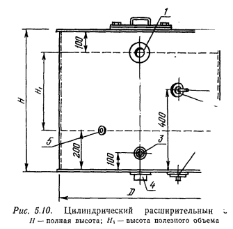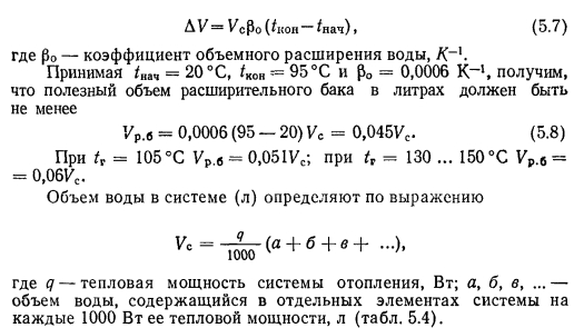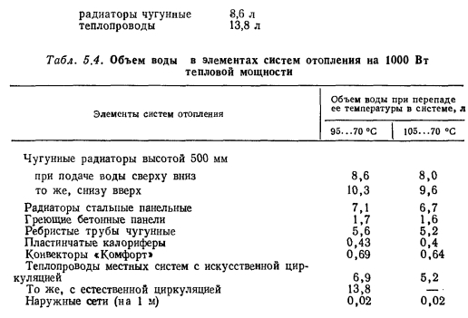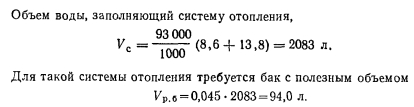 РАСШИРИТЕЛЬНЫЙ БАК И ОПРЕДЕЛЕНИЕ ЕГО РАЗМЕРОВРасширительный бак, как было отмечено в § 1.4, предназначается для восприятия прироста расширяющейся при нагревании воды, которой заполнена система отопления. Вторая функция расширительного бака — централизованное удаление воздуха из систем водяного отопления с естественной циркуляцией воды. Расширительный бак изготавливают сварным цилиндрическим с плоскими днищами. Материал — листовая сталь. Верхнее днище бывает съемным, а если оно наглухо приваривается к боковым стенкам, то в днище делается съемный люк для возможности осмотра к окраски бака изнутри. Расширительный бак имеет патрубки для присоединения к нему трубопроводов — расширительного 4, сигнального 5, переливного 1 и циркуляционного 3 (рис. 5.10), а при автоматической подпитке системы отопления водой и патрубки 2 для присоединения реле уровня. Расширительная трубка связывает бак с системой отопление и для большинства баков имеет диаметр Dy32. Перед пуском систе мы в эксплуатацию до уровня присоединения ее наполняют водок Сигнальную трубу диаметром Dy20 отводят в тепловой пункт к раковине и на ее конце устанавливают кран. Переливная труба Dy5 предохраняет расширительный бак от переполнения. Эту труб также отводят в тепловой пункт здания к раковине, в которую сливаются избытки воды. Через переливную трубу расширительный бак соединяется с атмосферой, что обеспечивает свободный дост> воздуха в него. Это необходимо из-за непостоянства уровня воды в баке вследствие изменения ее температуры. ![]() Циркуляционную трубу устанавливают в тех случаях, когда имеется опасение, что вода в расширительном баке замерзает. Чаще всего при строительстве в средних и южных районах европейской части СССР в циркуляционной трубе нет необходимости, так как расширительный бак покрывают тепловой изоляцией и помещают в высшей точке системы на опорах в утепленной будке, устанавливаемой на чердаке или под потолком лестничной клетки при бесчердачном покрытии здания. Циркуляция воды через расширь тельную трубу обеспечивает поддержание положительной темпера туры воды в расширительном баке. Полезным объемом расширительного бака является объем, заключенный между сигнальной и переливной трубами. Его величина определяется из следующих положений. Если для заполнения си стемы водой при ее температуре требуется объем воды, равный Ус (л), то при нагревании этой воды до температуры tK он, объем et увеличится на ![]() По найденному полезному объему расширительного бака определяют его геометрические размеры или же подбирают ближайший больший по объему расширительный бак, изготавливаемый заводами сантехдеталей по типовым рабочим чертежам. Пример. Подобрать расширительный бак для системы отопления с естественной циркуляцией воды, тепловая нагрузка которой 93 000 Вт. Отопительные приборы в системе — чугунные радиаторы. Решение. По табл. 5.4 находим, что на каждые 1000 Вт тепловой мощности системы в ее элементах содержится следующее количество воды: ![]() ![]() К установке следует принять ближайший по размеру расширительный бак типа 2Е010 с полезным объемом 101 л. Диаметр бака 570 мм, полная высота 710 мм, масса бака 45,9 кг (см. табл. III. 44 в «Справочнике по теплоснабжению н вентиляции). > Для восприятия прироста объема расширяющейся воды в системе может устанавливаться и закрытый 