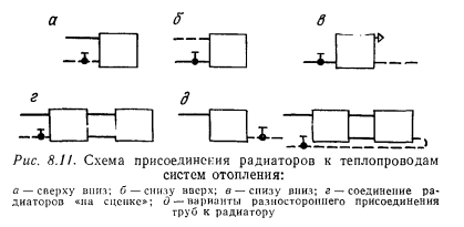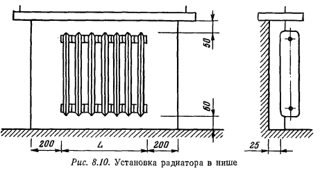 РАЗМЕЩЕНИЕ, УСТАНОВКА И ПРИСОЕДИНЕНИЕ ОТОПИТЕЛЬНЫХ ПРИБОРОВ К ТЕПЛОПРОВОДАМ СИСТЕМ ОТОПЛЕНИЯОтопительные приборы следует устанавливать у ограждений, теряющих тепло, т. е. у наружных стен и преимущественно под окнами. При такой расстановке приборов температура в помещении выравнивается, и влияние потоков воздуха, отдавшего тепло холодным поверхностям, менее ощутимо. При невозможности размещения приборов под окнами их можно устанавливать у наружных стен или у боковых помещений в непосредственной близости к наружным ограждениям. При установке приборов под витринами их необходимо размещать по всей длине световых проемов. В зданиях современного полносборного строительства отопительные приборы устанавливаются у стен, а при массивных кирпичных стенах их предпочтительнее устанавливать в нишах глубиной до 130 мм, устраиваемых в стенах или под окнами. Минимальные размеры ниши по длине и размещение в ней отопительного прибора в случае присоединения его на прямой подводке показано на рис. 8.10. Если на подводке к отопительному прибору устраивается утка, то ширина ниши должна превышать длину отопительного прибора на 0,6 м. В лечебных учреждениях отопительные приборы должны устанавливаться на расстоянии 100 мм от пола и 60 мм от стены. В зданиях любого назначения к отопительным приборам должен быть обеспечен доступ для их осмотра, ремонта и очистки. ![]() В жилых домах, общежитиях и гостиницах отопительные приборы можно размещать и не по оси оконного проема. Для унификации заготовок радиаторных узлов применяют смещенную установку отопительных приборов. Стояк в этом случае располагают на расстоянии 150 ±50 мм от откоса оконного проема, а подводки имеют постоянную длину: 380±20 мм. При диаметре подводок Zy25 длина их принимается 500 мм. ![]() Радиаторы устанавливаются, как правило, на кронштейнах, но допустима их установка на специальных металлических подставках. Размещение приборов в нишах глубиною более 130 мм либо укрытие их декорирующими решетками или щитами приводит к снижению теплоотдачи и к необходимости увеличения их греющей площади. Поэтому такая установка приборов допустима лишь при наличии достаточных обоснований. В помещениях, имеющих высоту более 5 м и второй ярус окон или световые фонари, отопительные приборы необходимо располагать не только внизу, но также под окнами второго яруса и под фонарями с расчетом возмещения части теплопотерь верхней зоны помещения. При необходимости размещения приборов под фонарями применяют гладкие трубы Пу80 или Z)y100. Отопительные приборы, предназначенные для обогрева лестничных клеток в зданиях до четырех этажей, устанавливают в одном месте — у входа в лестничную клетку. Присоединять такие приборы следует к отдельным стоякам по однотрубной проточной схеме. В зданиях большей этажности обогрев лестничных клеток осуществляется рециркуляционными воздухоподогревателями, располагаемыми также в нижних частях лестничных клеток. Греющими элементами воздухоподогревателей могут быть чугунные ребристые трубы либо конвекторы или высокие конвекторы с кожухом, выпускаемые Новокузнецким заводом «Сантехлит». Установка отопительных приборов в отсеках тамбуров, имеющих одинарные наружные двери, не разрешается. Присоединение отопительных приборов к теплопроводам системы отопления и питание их теплон