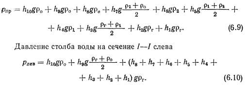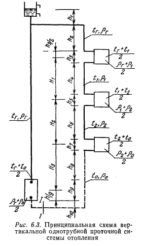 РАЗНОСТЬ ЕСТЕСТВЕННЫХ ДАВЛЕНИЙ, ДЕЙСТВУЮЩИХ В ВЕРТИКАЛЬНЫХ ОДНОТРУБНЫХ ПРОТОЧНЫХ СИСТЕМАХ ОТОПЛЕНИЯВ проточных однотрубных системах отсутствуют замыкающие участки у подводок к отопительным приборам, и вода, поступающая в стояк, проходит последовательно через все отопительные приборы. В случае двустороннего присоединения отопительных приборов к стояку вода распределяется поровну по обоим отопительным приборам, завися не от тепловой нагрузки, а от проводимости участков. Недостатком проточных систем является невозможность регулирования теплоотдачи отдельных приборов, так как любое изменение расхода воды через один из приборов неизбежно скажется на работе всех остальных приборов стояка, а выключение приборов на любом из этажей полностью прекращает движение воды по стояку. Поэтому проточные системы применяют только в зданиях, где не требуется местное регулирование теплоотдачи отопительных приборов. ![]() Разность естественных давлений в таких системах оказывается несколько больше, чем в системах с замыкающими участками, и сама система обладает высокой гидравлической устойчивостью. Рассмотрим принципиальную схему проточной системы (рис. 6.3), при этом допускаем, что в нагревателе и отопительных приборах по всей их высоте температура воды равна средней между температурами входа и выхода. Так же, как и при определении естественного давления для двухтрубной системы, выбираем в замкнутом контуре сечение и определяем разность давлений по обе стороны этого сечения. Давление столба воды на сечение I—I справа ![]() Вычитая уравнение (6.9) из (6.10) и произведя элементарные преобразования, получим