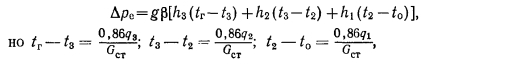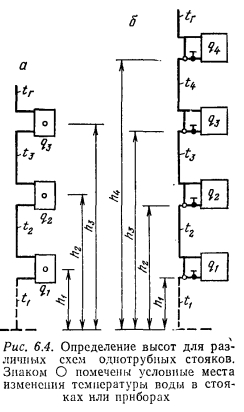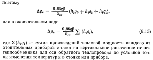 Суммы высот, стоящие в скобках, представляют собою расстояния по вертикали между центрами отопительных приборов верхних этажей и центром нагревателя и самым низкорасположепным прибором. Заменяя эти суммы соответствующими обозначениями, уравнение (6.11) запишется в окончательном виде так: ![]() Полученное уравнение по характеру построения похоже на уравнение (6.1) для стояка с замыкающими участками. Разница заключается в отсчете высот, которые для стояков с замыкающими участками принимаются между точками присоединения обратных подводок к стояку, а для проточных стояков — между центрами отопительных приборов. Поэтому при всех прочих равных условиях высота, на которую умножается самая большая разность плотностей, оказывается большей и соответственно большей получается разность естественных давлений. ![]() Формуле (6.12), определяющей разность естественных давлений для однотрубного стояка, можно, помимо вида (6.5), придать и несколько иной вид, записываемый более кратко. Сообразуясь с рис. 6.4, а, на котором изображен проточный стояк, разность давлений, создаваемую столбом воды высотою 13, можно выразить величиною gf>hz{tT~h) и затем добавить величины gh2(tz — t2) и (t2 —10), которые будут отражать прирост разности естественных давлений вследствие большего выстывания воды. Тогда ![]() ![]() Из рис. 6.4,6 следует, что формула (6.13) приемлема не только для однотрубных проточных систем отопления, но и для систем отопления с замыкающими участками. Следует лишь правильно определять значение высот, отсчитываемых от точек изменения температуры в стояке. Для определения полной величины разности давлений, действующей в циркуляционных кольцах проточных систем, необходимо к разности естественных давлений, определяемой формулой (6.12) или (6.13), прибавлять дополнительную разность давлений от остывания воды в теплопроводах с учетом особенностей определения ее величины для однотрубных систем (см. примечание 2 приложения IV). |