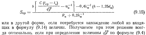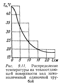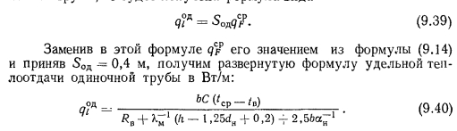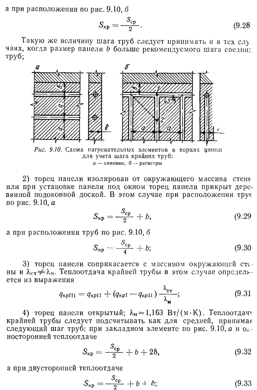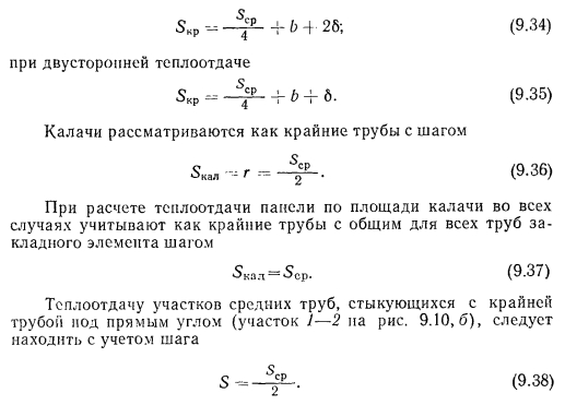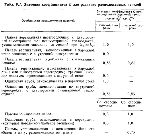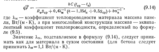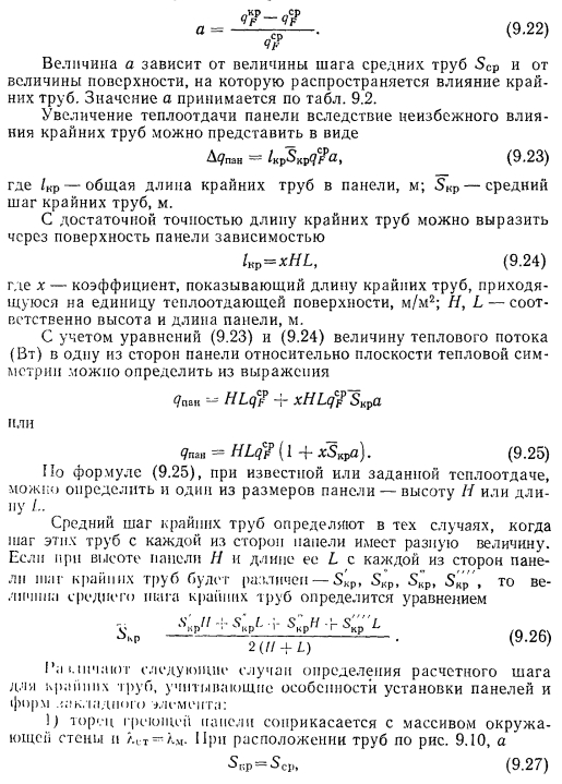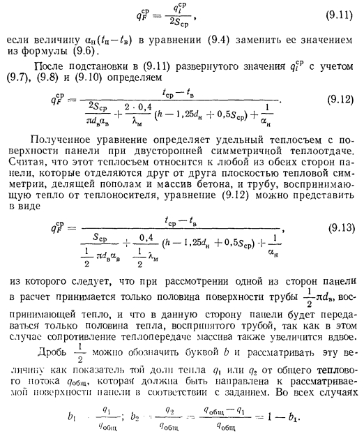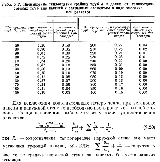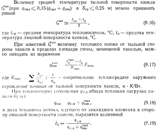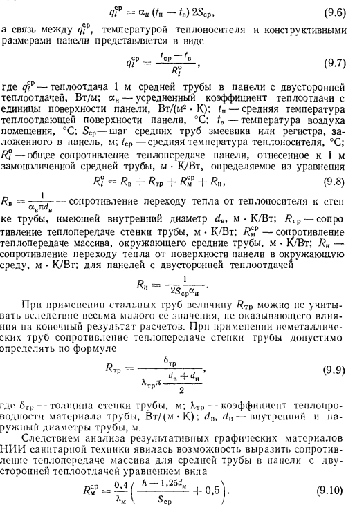 ТЕПЛОВОЙ РАСЧЕТ ГРЕЮЩИХ ПАНЕЛЕЙВ любом нагревательном приборе процесс передачи тепла от теплоносителя к наружной среде при постоянном значении термического сопротивления стенки прибора зависит от внутреннего ав и внешнего ан коэффициентов теплоотдачи. При применении искусственной циркуляции теплоносителя можно достичь больших значений ав. В условиях свободной конвекции с внешней стороны прибора значение ап по сравнению с ав чрезмерно мало. Коэффициент теплопередачи, а соответственно и величина теплового потока, идущего от теплоносителя в окружающую среду, определяются наименьшим из коэффициентов теплоотдачи. Поэтому при решении вопросов об интенсификации процессов теплопередачи всегда принимают меры для увеличения наименьшего из коэффициентов теплоотдачи. В условиях работы нагревательных приборов, отдающих тепло излучением й свободно развивающейся конвекцией, увеличивать значение практически невозможно. Единственным путем для увеличения съема тепла, воспринятого внутренней поверхностью прибора, является увеличение теплоотдающей поверхности путем создания, а для трубчатых нагревательных приборов — утолщение стенок трубы нанесением на ее поверхность слоя материала с хорошим коэффициентом теплопроводности. При этом благодаря увеличению наружного диаметра можно достичь резкого уменьшения сопротивления теплопередаче и увеличения общей теплопередачи от теплоносителя в окружающую среду. Описанный прием интенсификации теплопередачи носит название эффекта оребренйя и используется при конструировании бетонных греющих напелен. Увеличение толщины стенки трубы можно производить до определенного предела, при приближении к которому интенсивность роста теплопередачи замедляется, а дальнейшее увеличение диаметра приводит к снижению съема тепла. Пределом увеличения толщины стенки является критический диаметр, значение которого находится из зависимости ![]() Применительно к бетонным панелям при А= 1,1 Вт/(м К) критический диаметр ![]() Сложность расчета плоских бетонных нагревательных приборов заключается в том, что толщина слоя бетона, окружающего трубу, неодинакова, и это затрудняет определение сопротивления теплопередаче массива бетона Rn. Расположенные рядом трубы ухудшают условия теплопередачи. Трубы, расположенные по краям панели, отдают больше тепла, чем трубы, заложенные в середине. Температура на поверхности панели тоже неравномерна. Наибольшая температура всегда будет над трубой, а наименьшая — посередине расстояния между трубами. При змеевиковой форме закладного греющего элемента прогрев панели и температура ее поверхности также будут неодинаковы. Все эти факторы и определяют своеобразие расчета панелей, который производится, как правило, по средним величинам. Наиболее распространенным методом расчета вертикальных панелей, правильно отражающим физическую сущность тепловых процессов, является метод, предложенный НИИ санитарной техники. Этот метод предусматривает разделение заложенных в панели труб по особенностям их теплоотдачи на средние, крайние и одиночные (рис. 9.7), различает способы установки панелей в помещении и в соответствии с этим устанавливает особенности в определении и учете некоторых расчетно-конструктивных элементов панели, которыми, как это показано на рис. 9.8, явля
